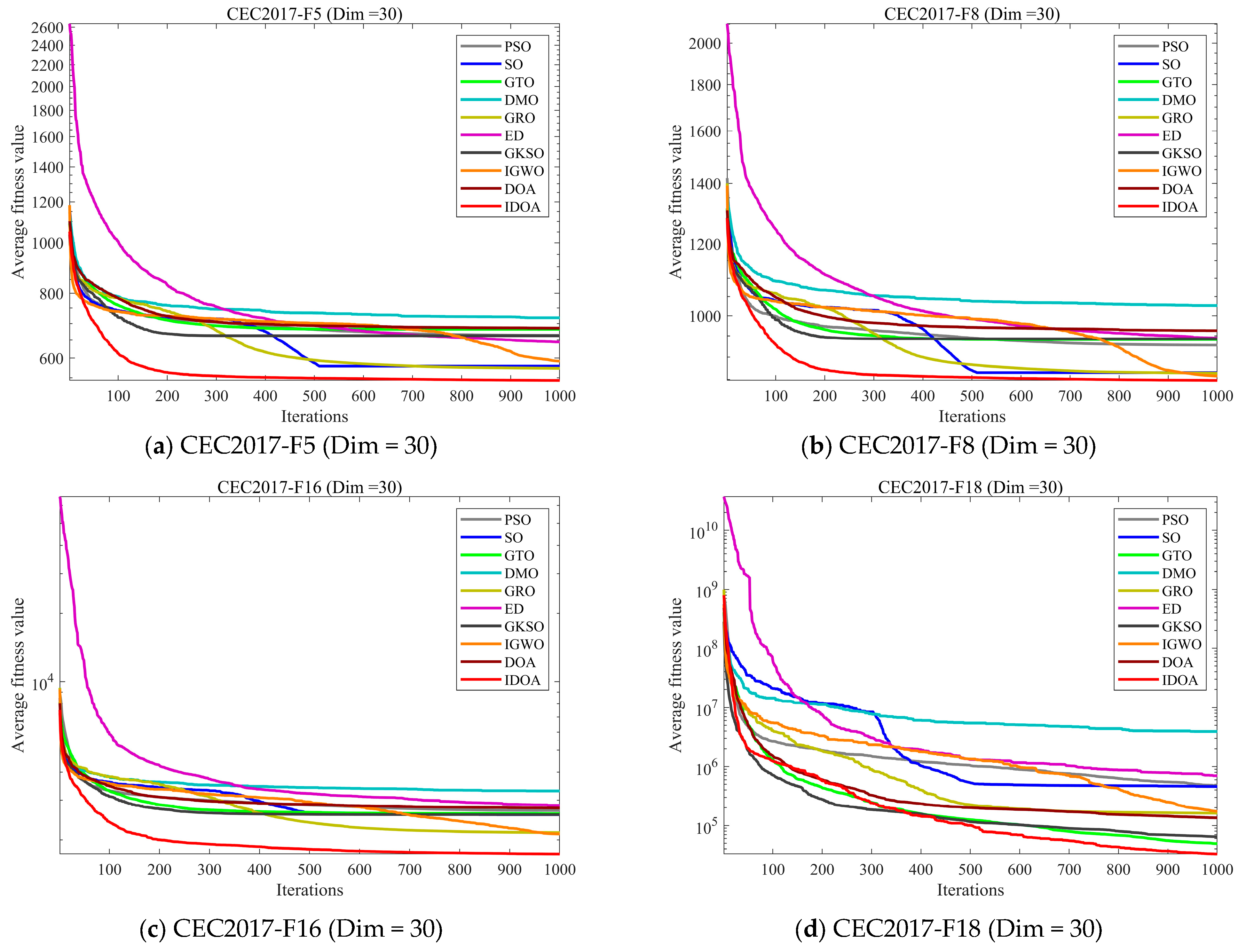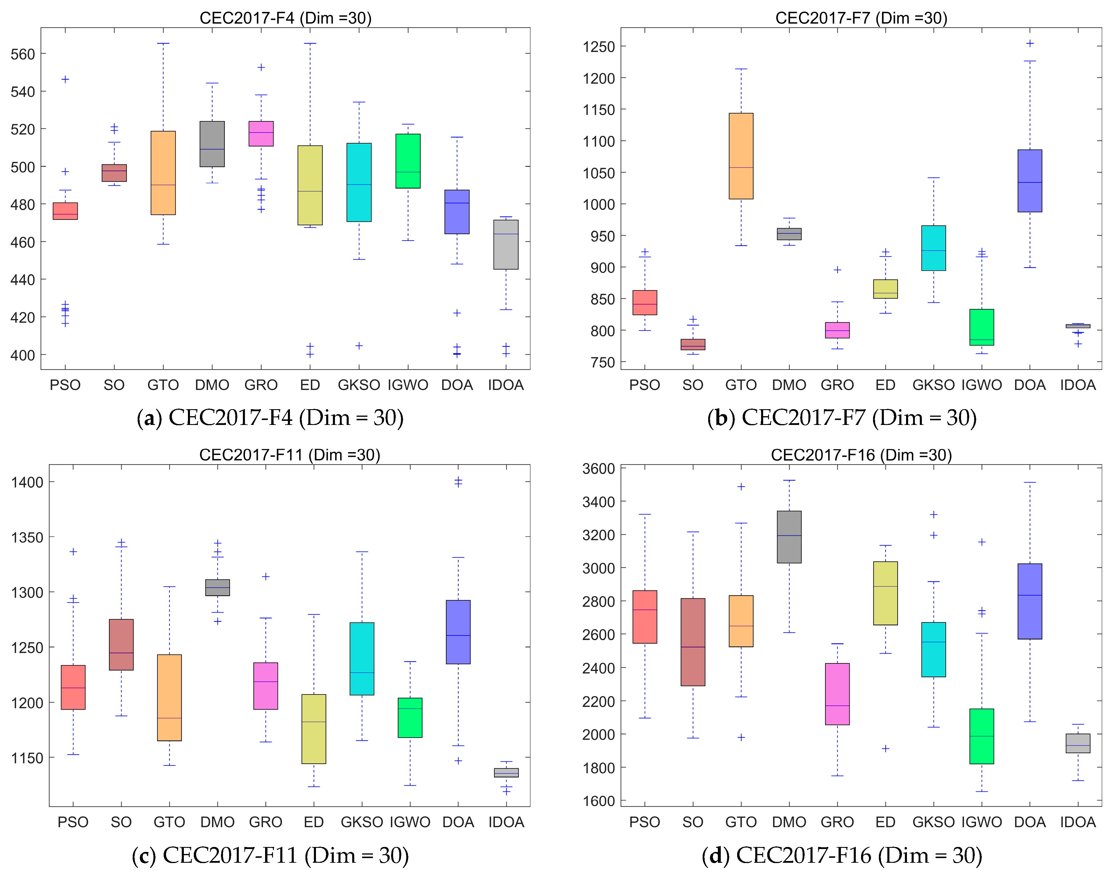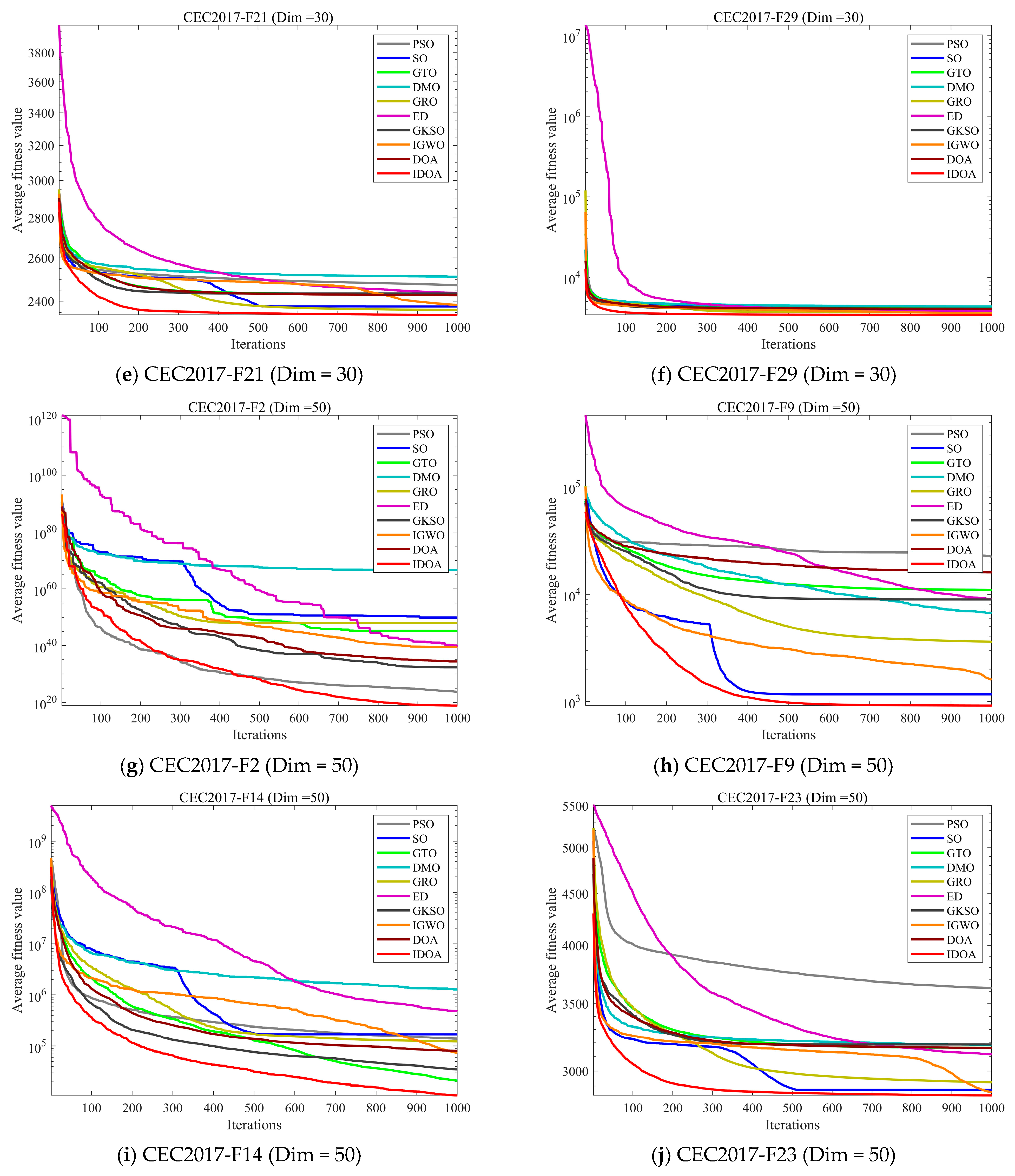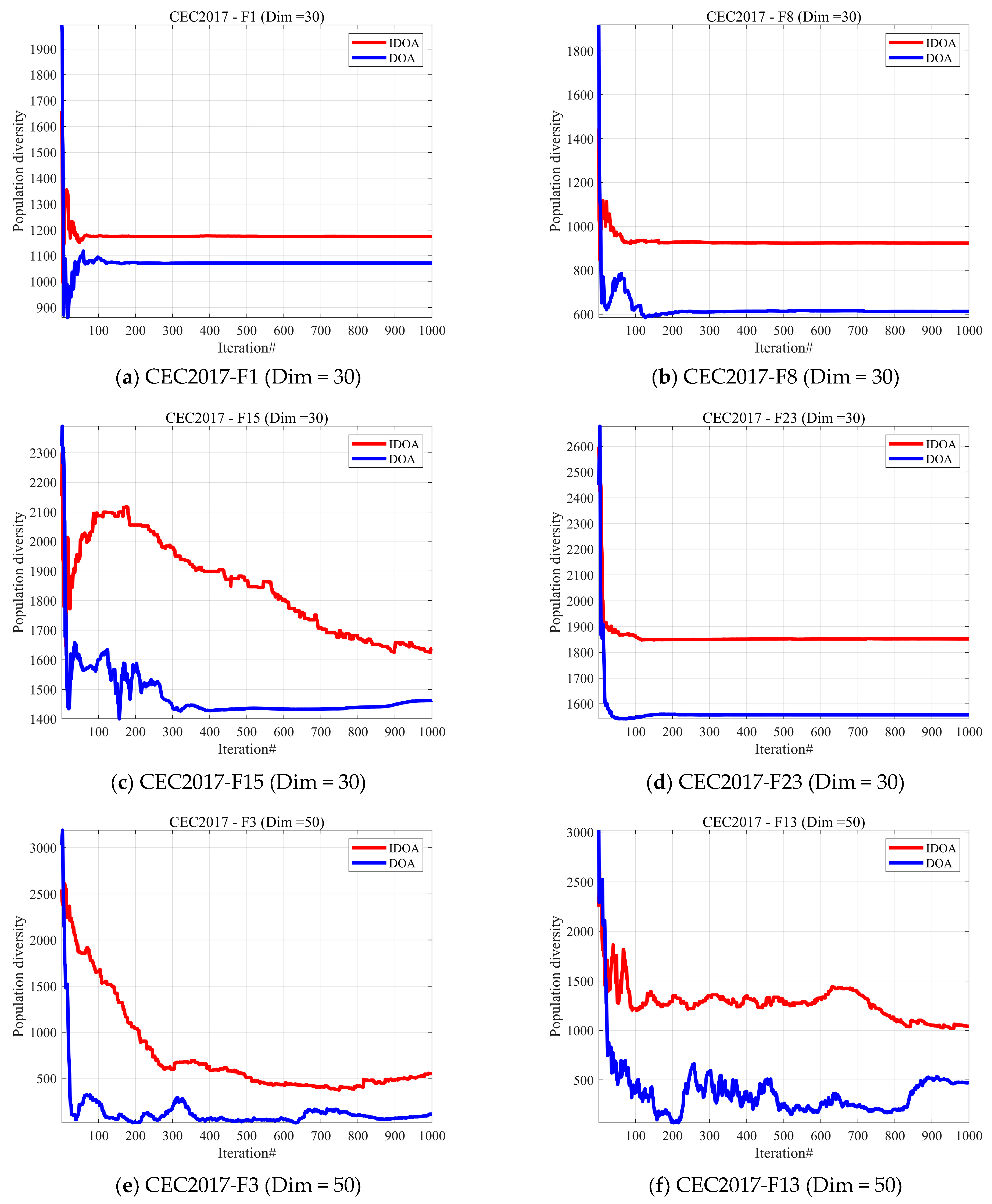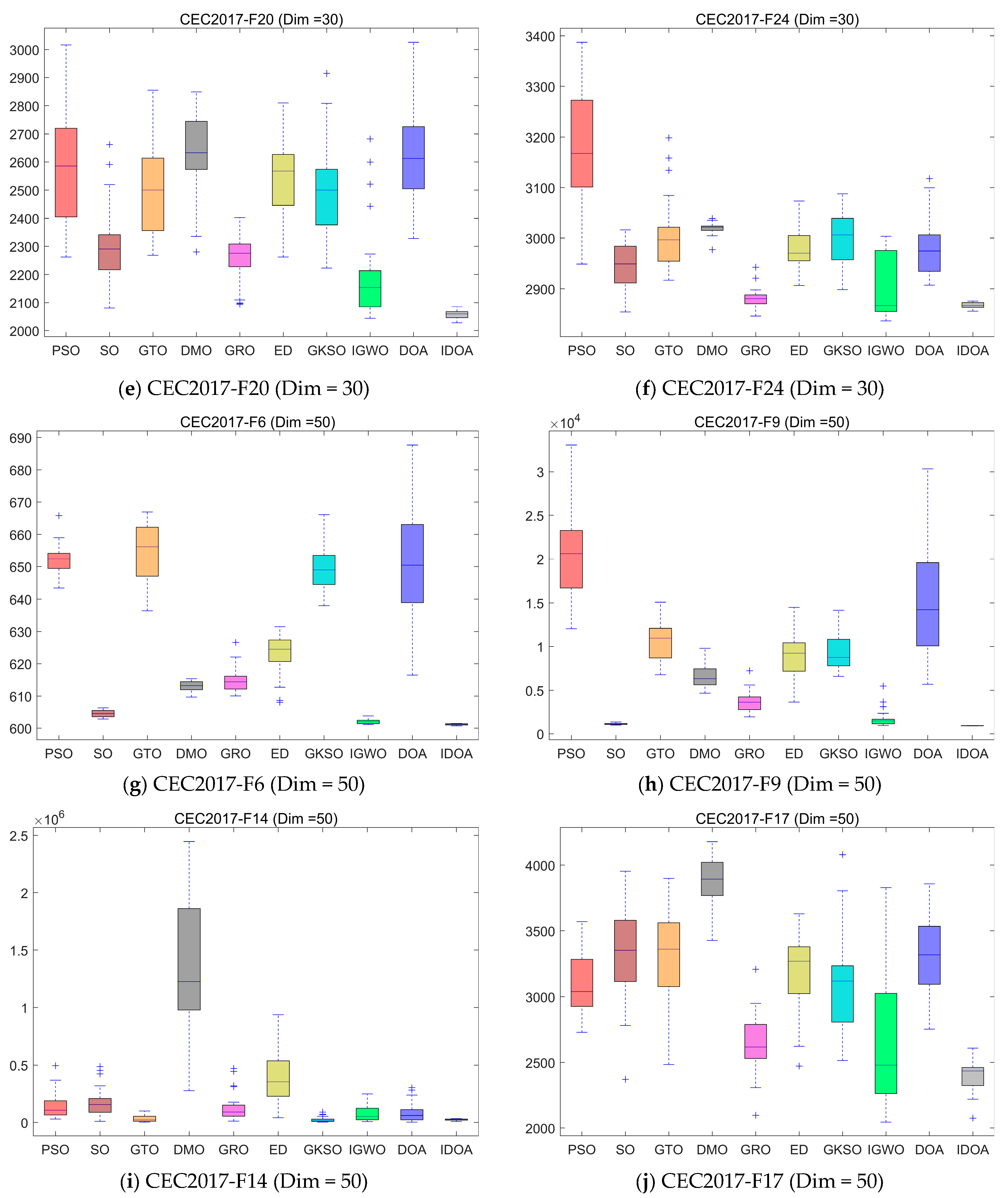 • The algorithms were qualitatively analyzed using 30 test functions from the IEEE CEC2017 test set and compared with 9 other algorithms to obtain competitive results. Most importantly, the algorithms were statistically analyzed to fully analyze the superior performance of IDOA.