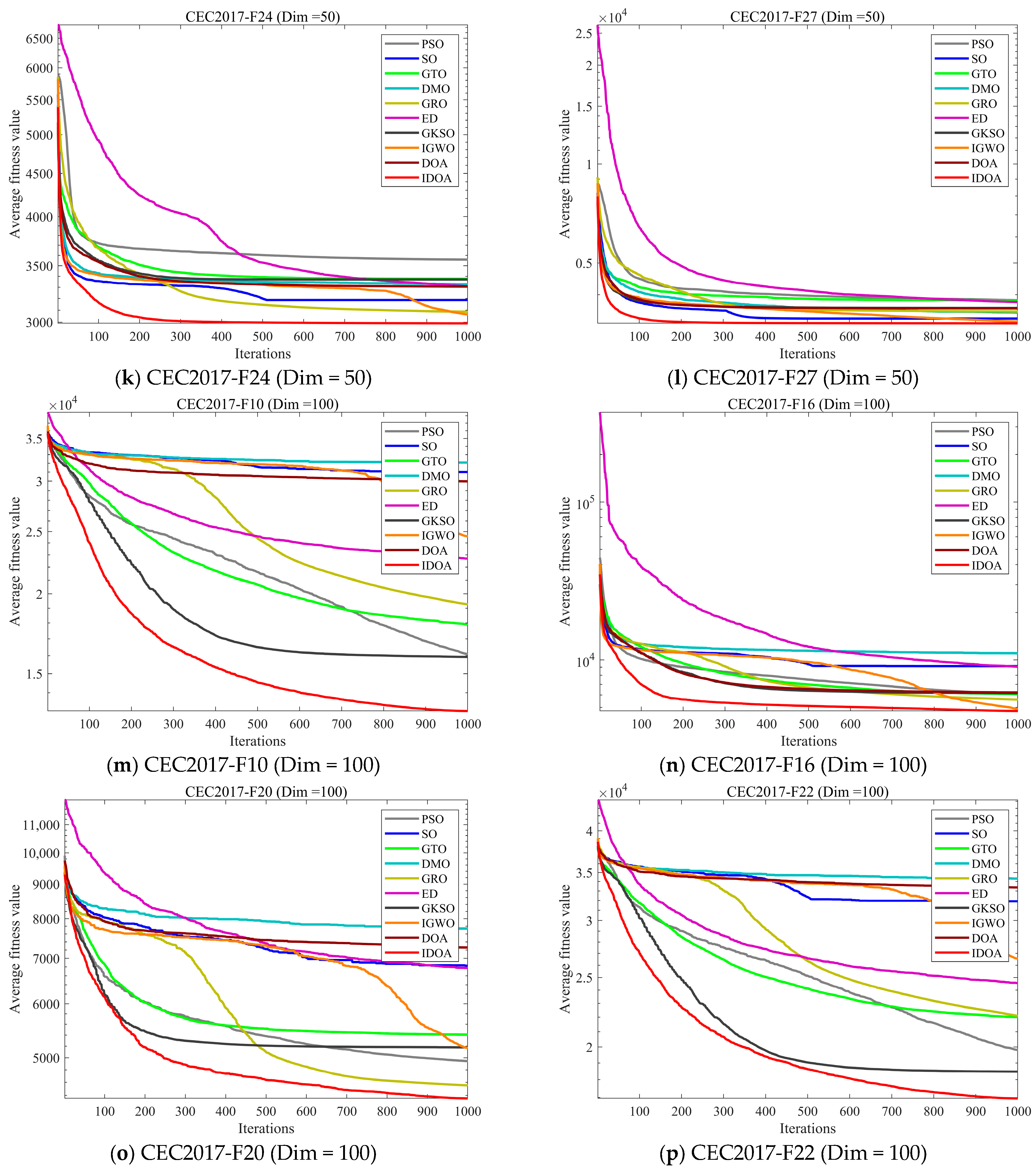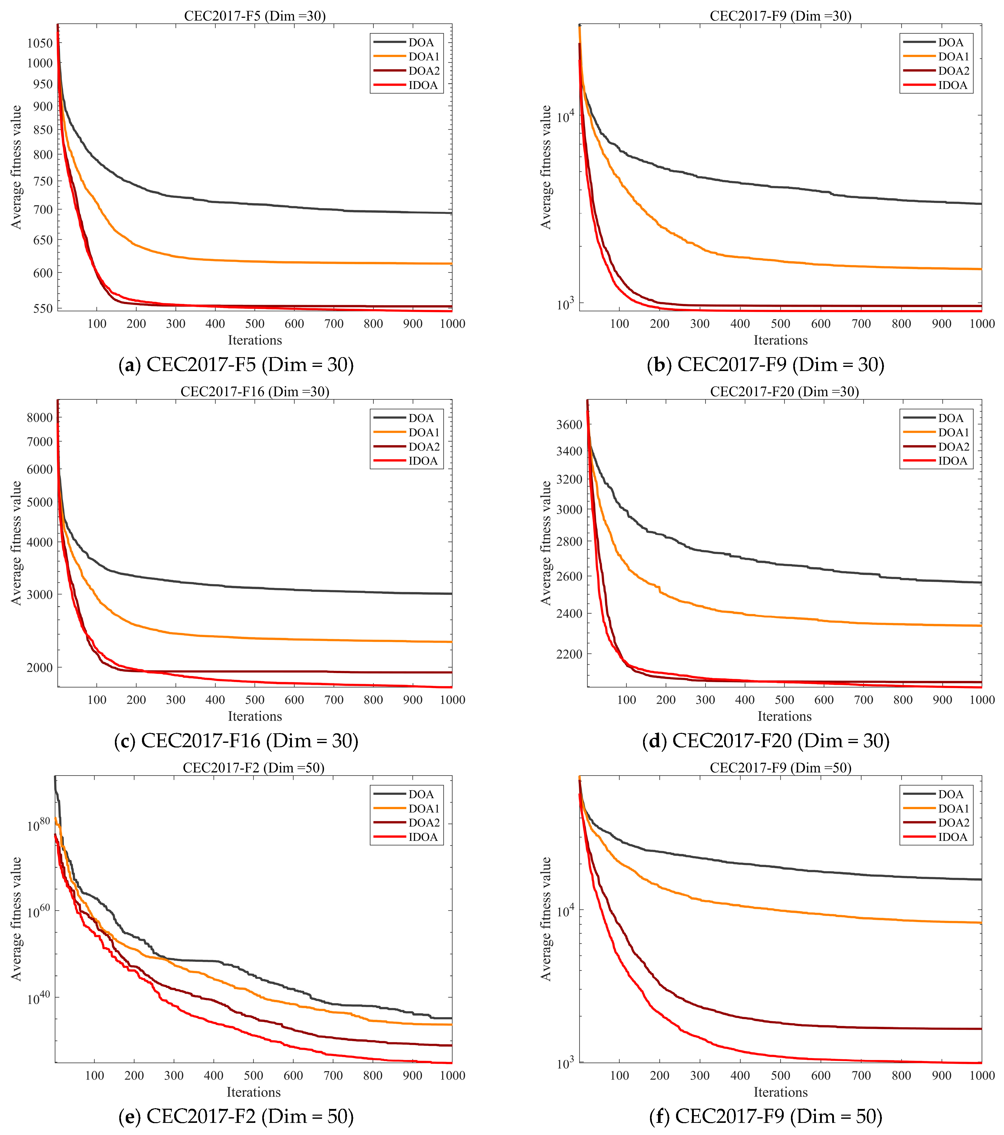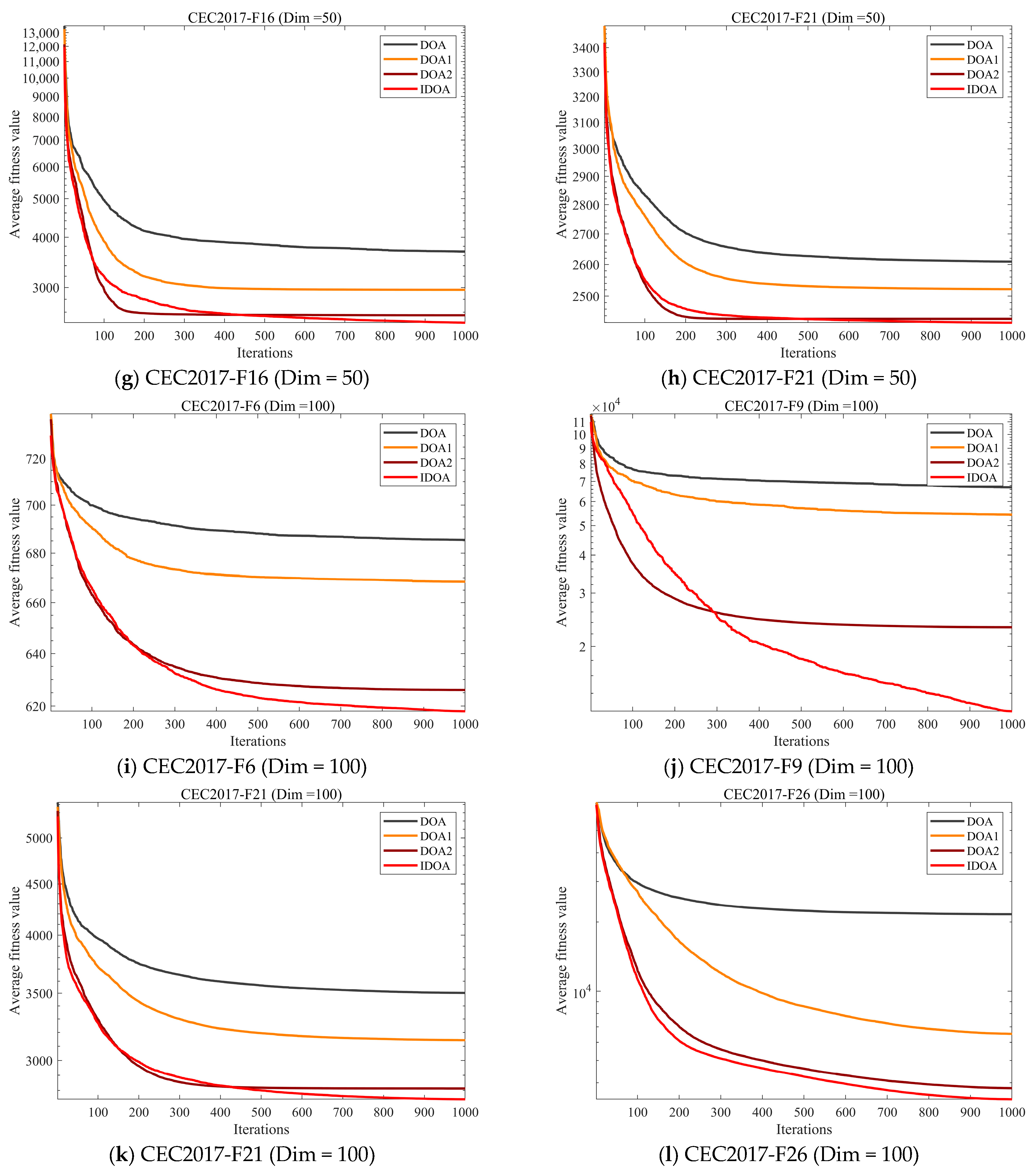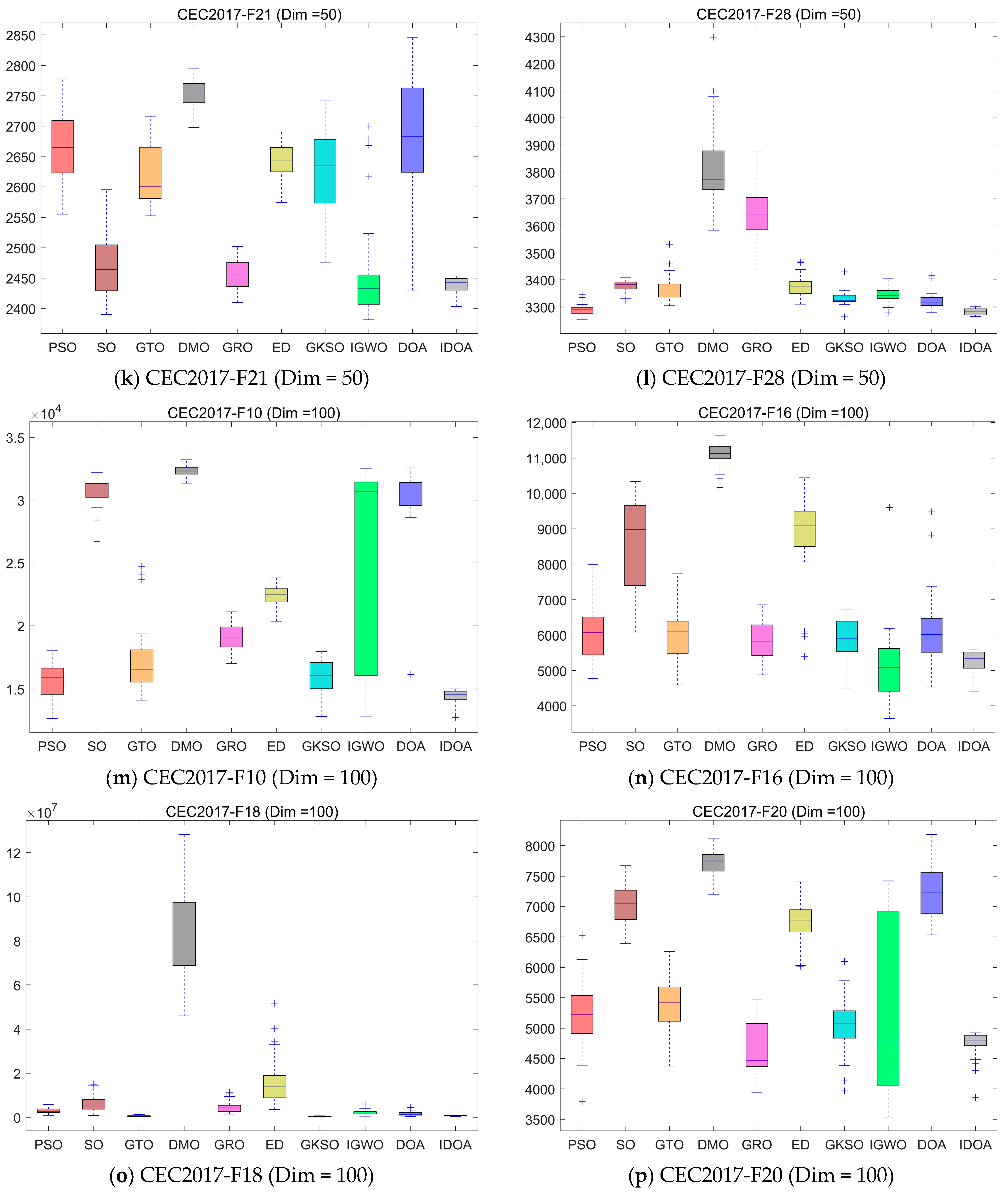• The algorithms were qualitatively analyzed using 30 test functions from the IEEE CEC2017 test set and compared with 9 other algorithms to obtain competitive results. Most importantly, the algorithms were statistically analyzed to fully analyze the superior performance of IDOA.