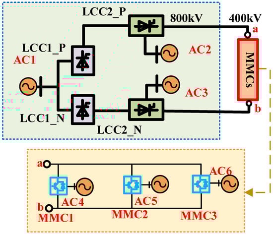 The bipolar hybrid cascaded multi-terminal HVDC topology represents a highly efficient and advantageous configuration. This topology is structured such that the LCCs are integrated as a series component of the system, owing to their efficiency in transferring substantial quantities of power over extended distances with minimal energy losses. The innovative MMCs are implemented on the inverter side and are interconnected in parallel, as they possess the capability to facilitate flexible power transmission and exert control over reactive power, rendering them particularly suitable for regional grid applications.