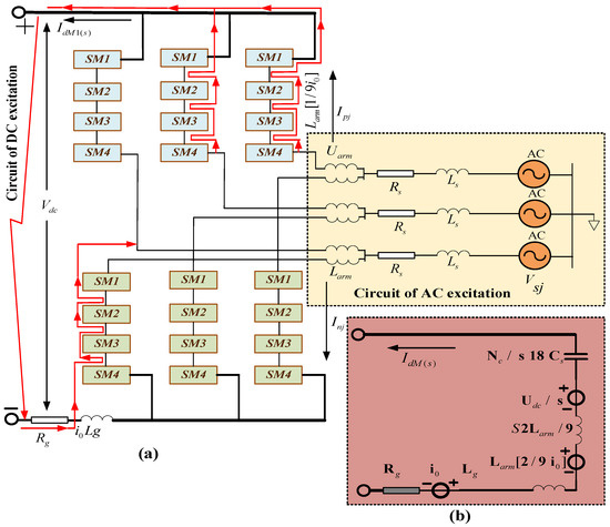When an asymmetrical DC fault occurs, the excitation source driving the MMC response is composed of three parts: (i) the stored energy of the submodule capacitors, (ii) the initial current in the bridge arm reactor, and (iii) the current in the DC smoothing reactor.