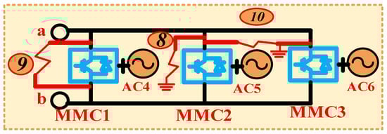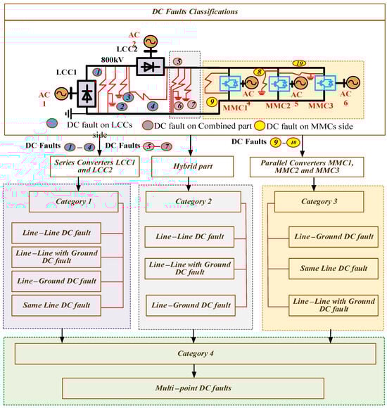 In Figure 4, the DC faults are systematically classified into four distinct categories, specifically categorized as category 1, category 2, category 3, and category 4. Focusing on the LCCs’ side, we consider category 1, which encompasses a total of four DC fault types, namely DC fault 1, DC fault 2, DC fault 3, and DC fault 4. Within the hybrid segment of the bipolar hybrid cascaded MTDC system, category 2 is examined; in this category, we delineate three specific DC faults, identified as DC fault 5, DC fault 6, and DC fault 7. Regarding the MMC section, we investigate category 3, which also comprises three notable DC faults. These DC faults are designated as DC fault 8, DC fault 9, and DC fault 10. Category 4 is derived from the entire hybrid cascaded system, wherein multipoint DC faults are elucidated. Such multipoint DC faults have the potential to manifest in any segment of the system, potentially arising in the LCC section while, concurrently, another fault may occur within the MMC segment. In this paper, an illustrative example of a multipoint DC fault is presented.