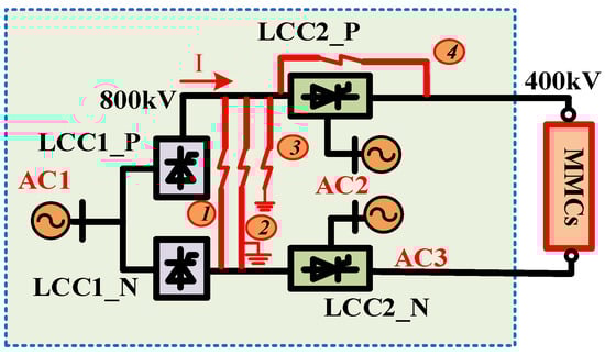 Figure 11 shows the results of category 2. DC fault 4 is illustrated as an example, with the first end located before LCC2 and the second end situated after LCC2, both at the same pole, which is the positive pole. This fault is quite intricate due to its bifurcation into two distinct regions. The control requirements for this type of DC faults are as follows.