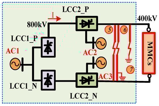 - DC fault 2: This asymmetrical DC fault is the internal fault occurring between the two LCCs. This DC fault 2 is a line-to-line DC fault with grounding. Figure 4 demonstrates that, during an asymmetrical DC internal line-to-line short-circuit fault, the impact on the ground is similar, with little difference, as confirmed by the subsequent simulation results. A minimal disparity in the increase in current is observed when comparing this fault with line-to-line DC faults with the ground.