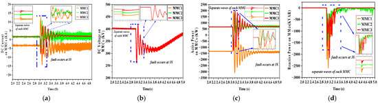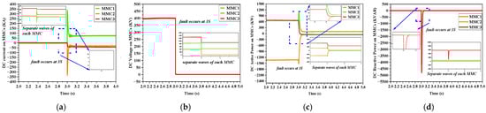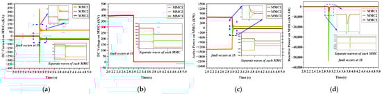 Figure 13 illustrates the outcomes pertaining to category 4. Within category 4, three unique DC faults demonstrate analogous characteristics, all manifesting within the hybrid component of the system. These DC faults are situated on the side of the MMCs. Such DC faults are alternatively referred to as midpoint DC faults. Within this classification, the occurrence of DC faults results in an abrupt decline in voltage to a level of zero, coupled with a significant increase in current.