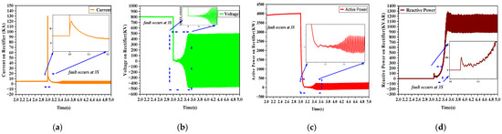 Figure 8 shows the results of category 1. In category one, three distinct DC faults exhibit the same characteristics, all occurring on the LCC side. These three DC faults comprise a line–line DC fault, line–line with ground DC fault, and line–ground DC fault. These DC faults are exceedingly perilous, as they induce an abrupt escalation in the amplitude of current, thereby leading to a significant augmentation in current intensities. The regulatory requirements pertaining to these DC faults are outlined as follows.