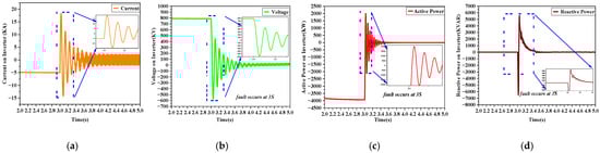 Figure 14 illustrates the outcomes pertaining to category 5. Within the category 5, multipoint DC faults demonstrate analogous characteristics. Within this classification, the occurrence of DC faults results in an abrupt decline in voltage to a level of zero, coupled with a sudden increase in current.