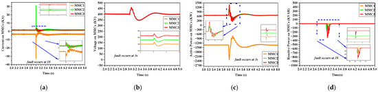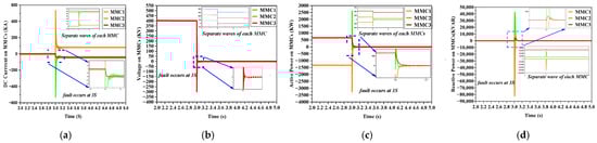 - MMCs and LCCs adjust the output voltage in real-time scenarios. In order to attenuate the DC fault current, it is advisable to augment the firing angle on the rectifier side and to employ the MMC for reactive power compensation to ensure voltage stabilization.