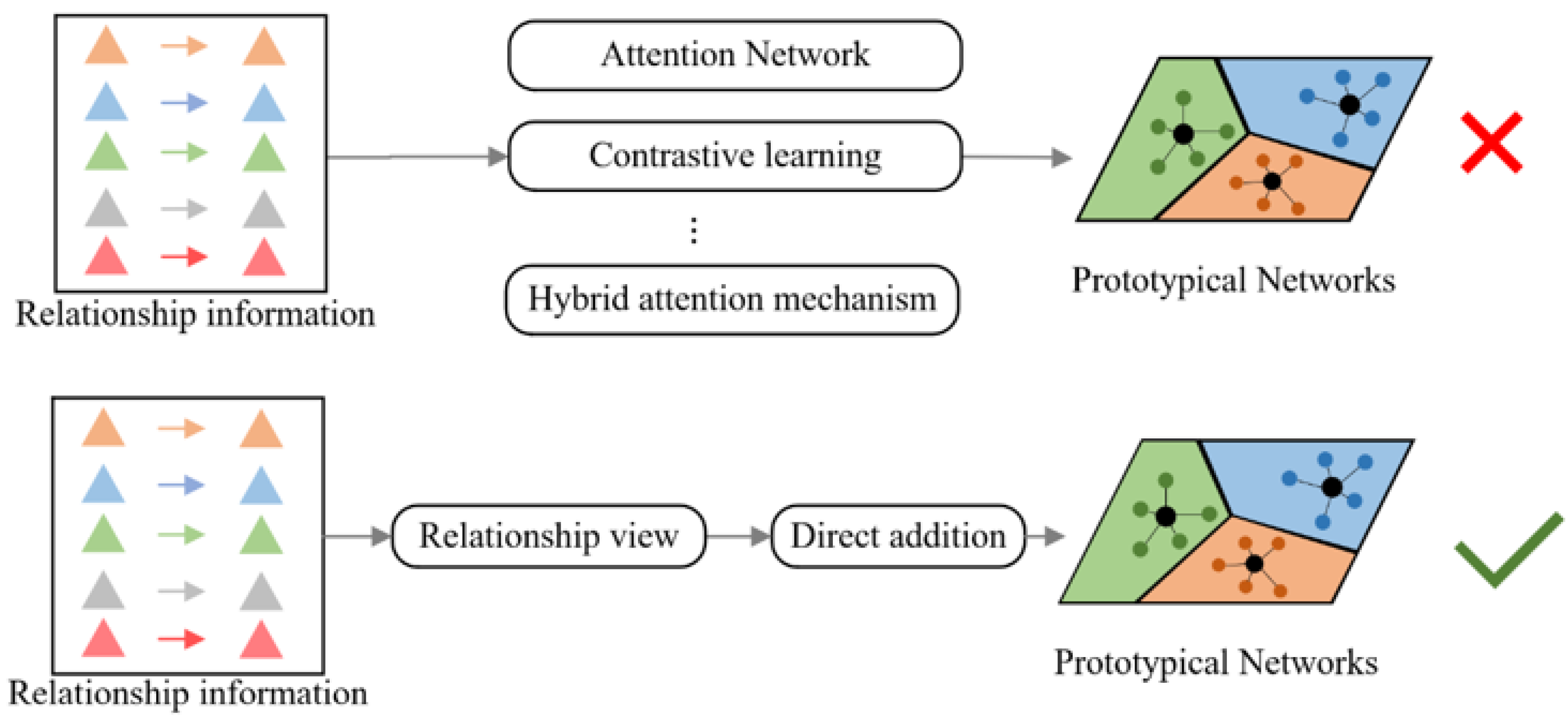 - By focusing on optimizing the representation of category prototypes, the aim is to reduce intra-class distances and expand inter-class differences, thereby improving the classification accuracy of the model. For instance, Han et al. [13] proposed a Hybrid Contrastive Relation Prototype (HCRP) method, which adopts relation description information as anchors to bring similar prototypes closer and push different prototypes farther apart in the representation space; Dong et al. [14] designed a semantic mapping framework, MapRE, based on label-aware and label-irrelevant semantic information, which enhances the generalization performance of the model by combining similarities between samples and between samples and labels; Sun et al. [15] proposed a hierarchical attention prototype network that combines multi-channel convolution feature extraction with adversarial sample generation to further optimize the feature representation of the model.
