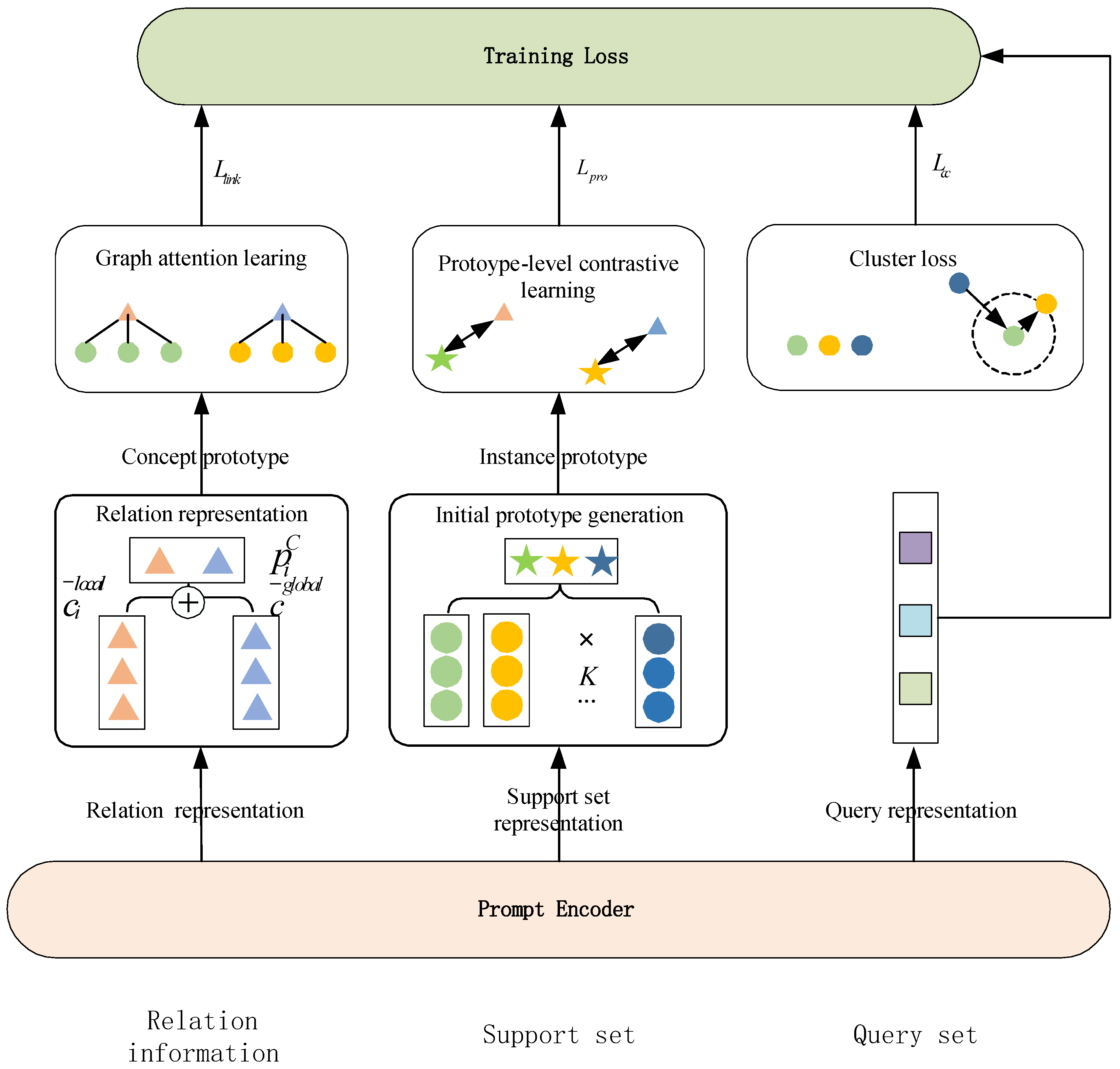 - We design a prompt encoder that can structurally encode different prompt templates while maintaining processing symmetry for instance and relationship information. Meanwhile, these encoded prompts are input into a Large Language Model (LLM), which utilizes its powerful semantic understanding capabilities to obtain high-quality representations of instances, instance prototypes, and conceptual prototypes;