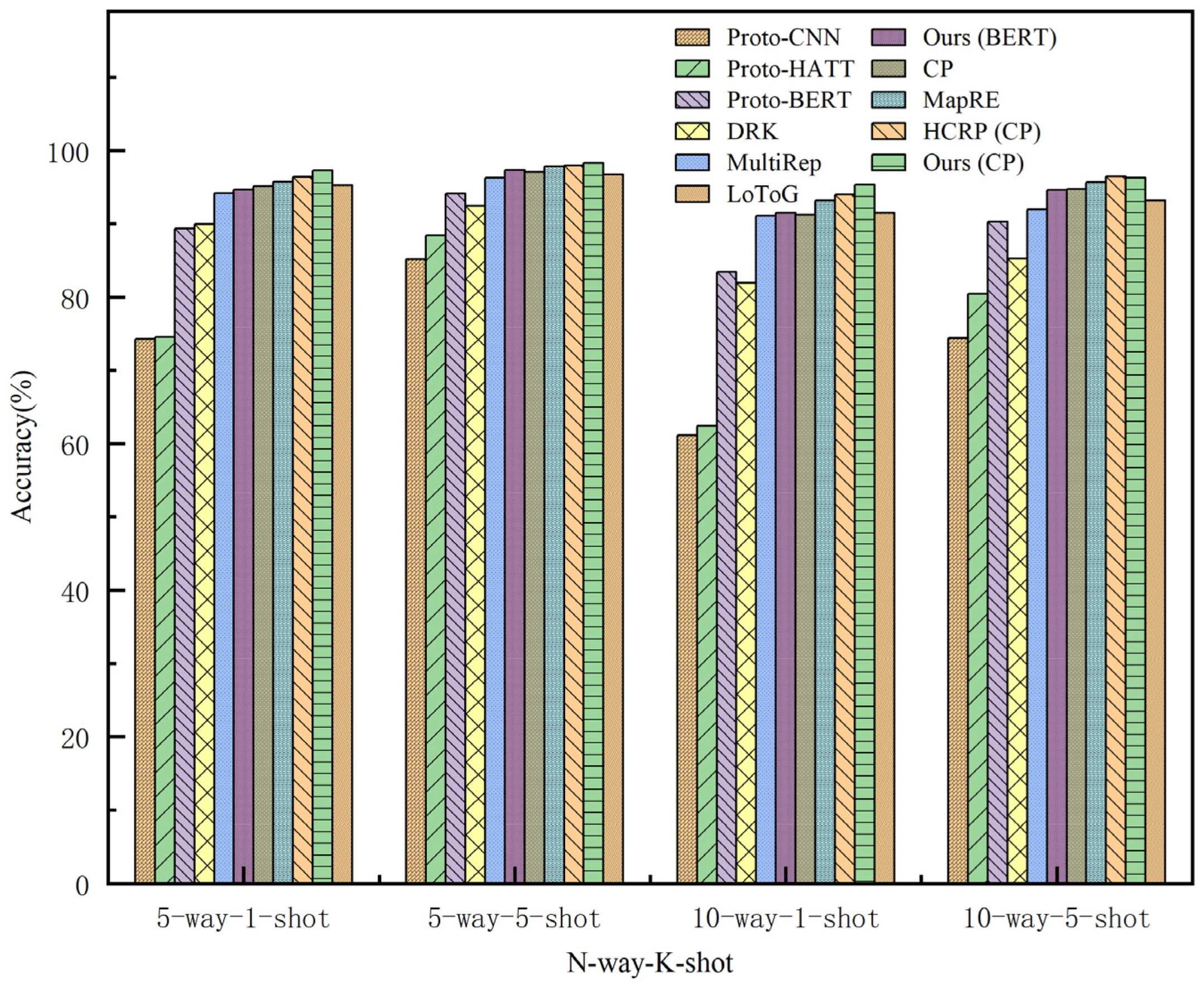 - When using CP as the pre-trained model, the proposed model outperforms the state-of-the-art HCRP(CP) model in two few-shot settings (5-way-1-shot and 10-way-1-shot), with improvements of 0.83% and 1.38%, respectively.