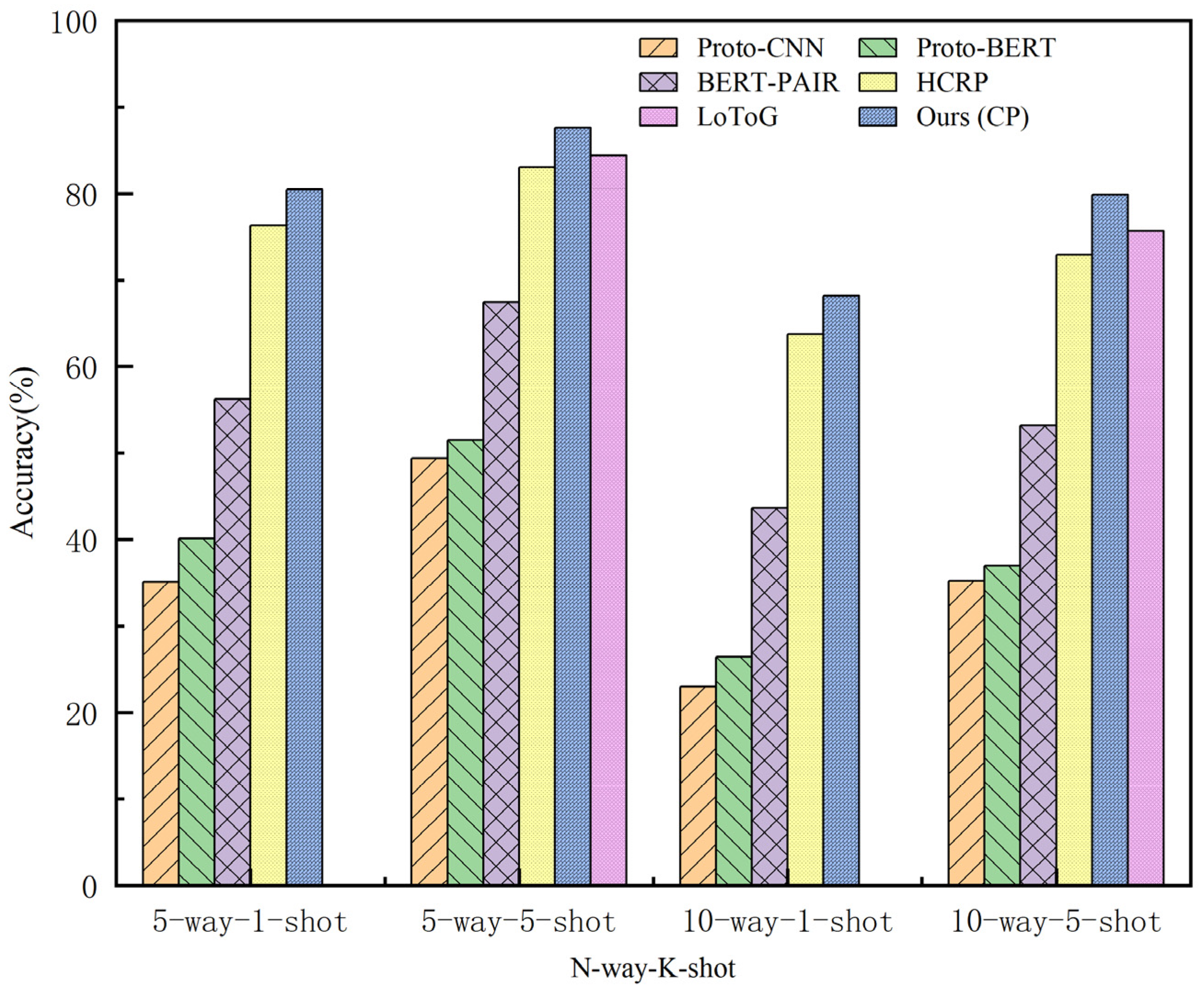 - Our model surpasses typical external information methods (HCRP, LoToG). Specifically, it outperforms HCRP by at least 4% in accuracy across N-way-K-shot settings, demonstrating that integrating relation information in the feature space is more effective than direct incorporation. It also exceeds LoToG by at least 3%, highlighting the critical importance of enhancing instance/prototype representations through the complementarity of relation-specific features and intra-class common features.