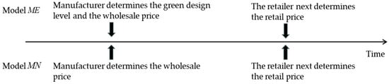 13]. The manufacturer is responsible for product development and production, with the opportunity to implement green design in the early stages to reduce energy consumption and the unit product’s environmental impact. The retailer is responsible for product sales. Although our model focuses on the manufacturer–retailer dyad, this structure captures the core strategic interface in many durable goods supply chains—such as consumer electronics and home appliances—where decisions on green design and pricing are predominantly driven by these two parties [