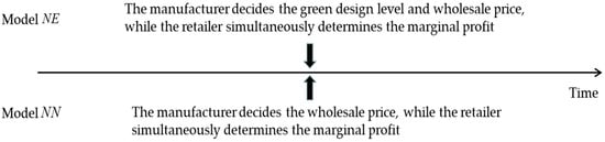 23]. To capture the influence of channel power structure on green design decisions and environmental outcomes, we consider three game structures: a manufacturer-led Stackelberg game, a retailer-led Stackelberg game, and a Nash game representing a balanced power structure. From the perspective of environmental responsibility, we explore how shifts in channel power affect manufacturers’ incentives to invest in green design, and how these changes influence the economic and environmental performance of the supply chain.