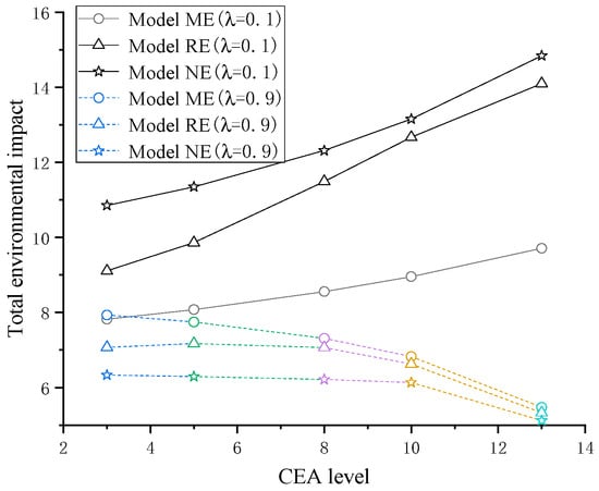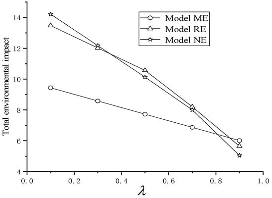 Proposition 7 shows that, when the unit green design level is small, which means the reduction of the unit environmental impact can only be achieved to a minor degree, the channel power structure dominated by the manufacturer contributes more to the total environmental impact, while the Nash game channel power structure performs the worst. With an increase in , the channel power structure that is most useful to the reduction of the total environment impact will gradually change from a manufacturer-led to a Nash game structure. The channel power structure that is most unfavorable to reducing the total environment impact will gradually change from a Nash game to a retailer-led structure, and finally to a manufacturer-led structure. This occurs because total impact hinges on two factors: product sales volume () and per-unit environmental impact under green design. Consequently, when is small, product sales volume exerts a more pronounced influence on total environmental impact. When increases, the unit environmental impact reduces, and exerts a more pronounced influence on the total environmental impact.