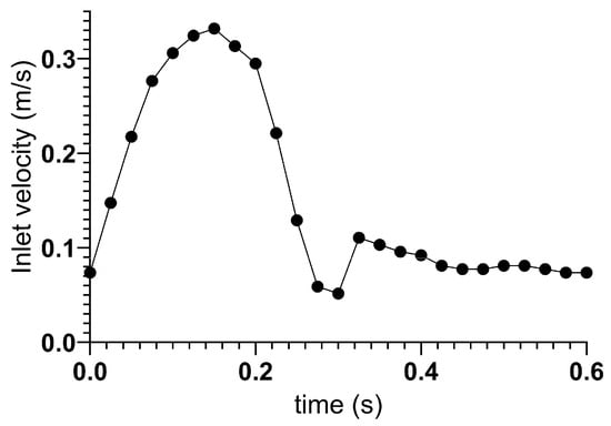 The vascular wall was treated as a no-slip boundary. The aorta and renal artery outlets are pressure outlets. The inlet boundary on the aorta was a velocity–time curve of a cardiac cycle [,]. Figure 1 shows the inlet velocity curve.