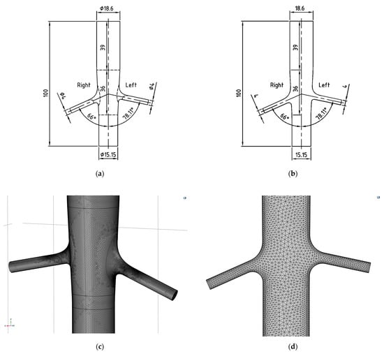 Three- (a) and two-dimensional (b) models based on angiography measurements and three- (c) and two-dimensional (d) meshes in COMSOL Multiphysics.