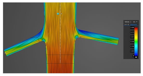 The simulations performed with Ansys 2024 R2 Discovery software took significantly less time than those performed with Ansys Fluent. Ansys Fluent works with a fine tetrahedral mesh and uses a turbulence model, and we ran a transient simulation. The running time per simulation was approximately 1.5 h, with a minimum preparation time of 30 min. Ansys Discovery applies voxel-based calculations, and transient simulations cannot be run, nor can turbulence models be applied. Thus, dynamic effects cannot be evaluated. Figure 3 shows the presumed laminar flow in the inspected area; streamlines are coloured based on velocity in Ansys Discovery software.