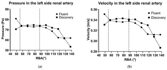 Pressure (a) and flow velocity (b) in the factor of the renal artery branching angle in Fluent and Discovery software.