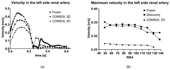 The results of the 2D calculations show some inaccuracy, as predicted. In Figure 5, it is shown in both panels that the velocity values are lower than expected. In panel (a), the velocity values are presented during a heart cycle. The COMSOL 2D results are similar in the systolic phase but markedly different in the diastolic phase. In panel (b), the maximum velocity values are presented as a factor of the renal artery angulation. The lower velocities given by COMSOL 2D simulations can be seen, but the curve has similar characteristics to the curve produced by Fluent.