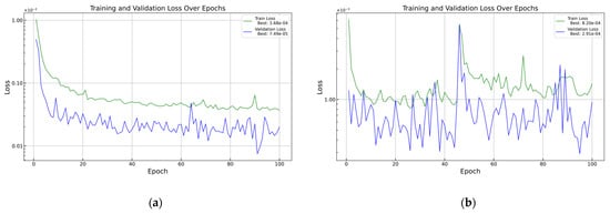 As a comparison, some tests were carried out on the vL dataset with a 0.003 training rate, but the training went chaotic, as shown in Figure 6, panel (b). Thus, the training rate was kept at 0.001.