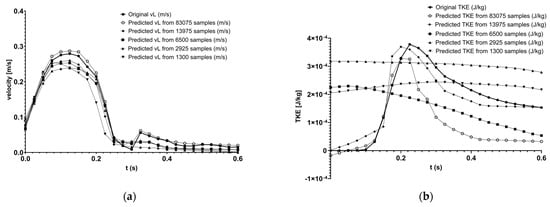 Original and predicted velocity (a), and TKE (b) curve comparison in COMSOL using different sample counts.
