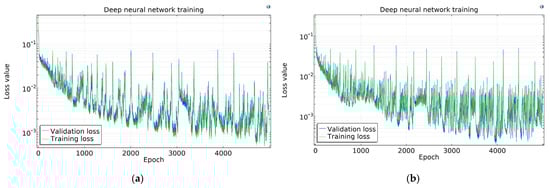The COMSOL Loss functions are presented in Figure 9. The loss curves have high fluctuation; however, this seems higher than it really is because of the log scale on the y-axis. It is apparent that the more samples are used, the higher the fluctuation is, thanks to the same absolute batch size and thus decreasing batch–sample ratio.