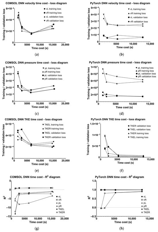 Time cost–loss diagrams in COMSOL for (a) velocity, (c) pressure, and (e) turbulent kinetic energy; time cost–loss diagrams in PyTorch for (b) velocity, (d) pressure, and (f) turbulent kinetic energy, and time cost–R2 diagrams in (g) COMSOL and (h) in PyTorch.