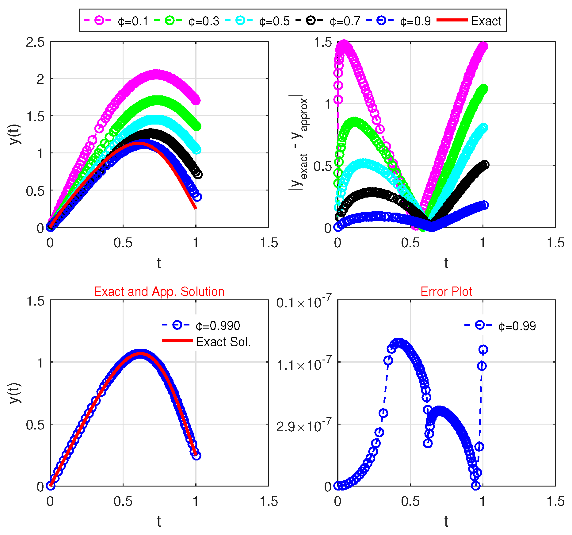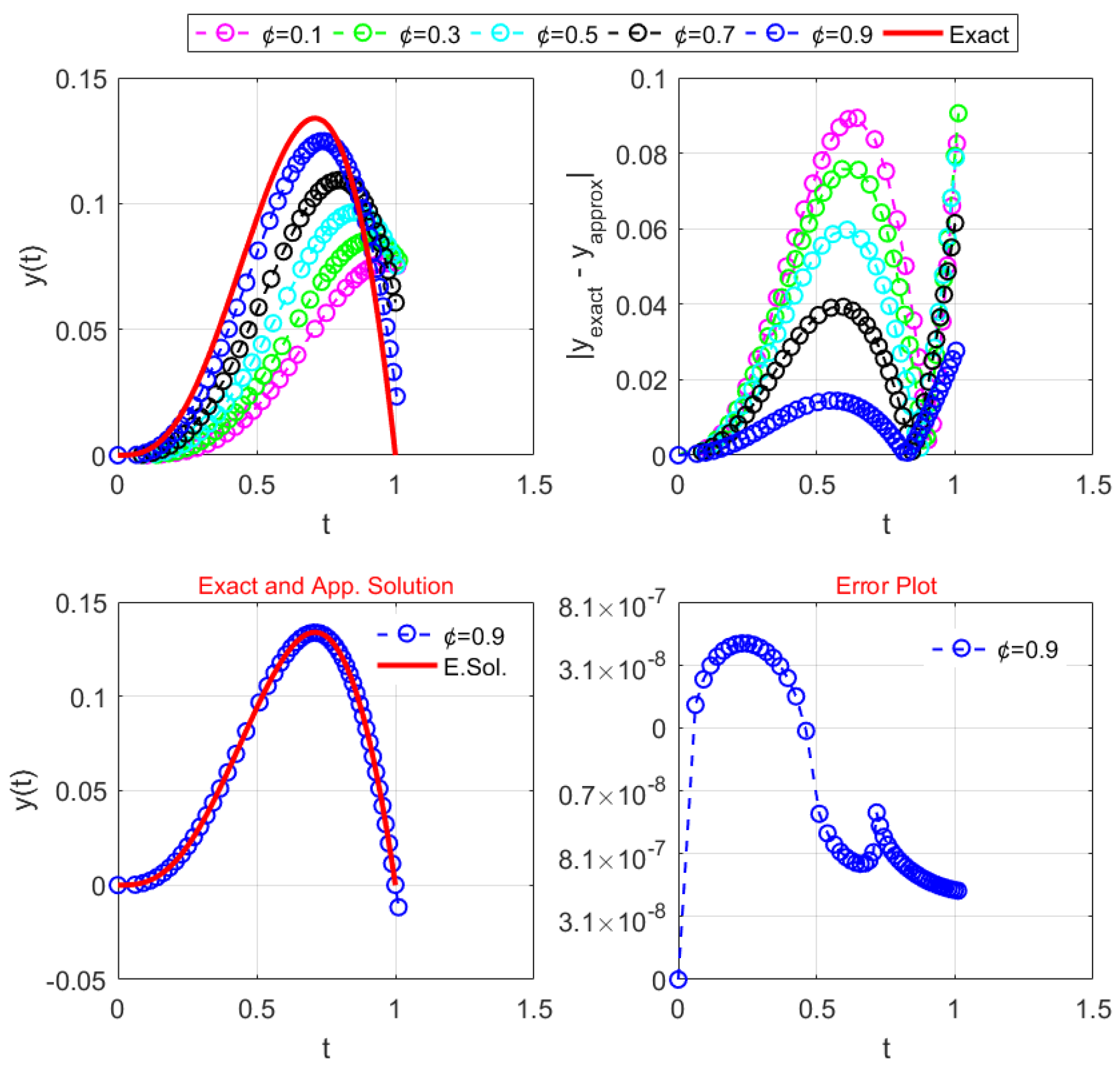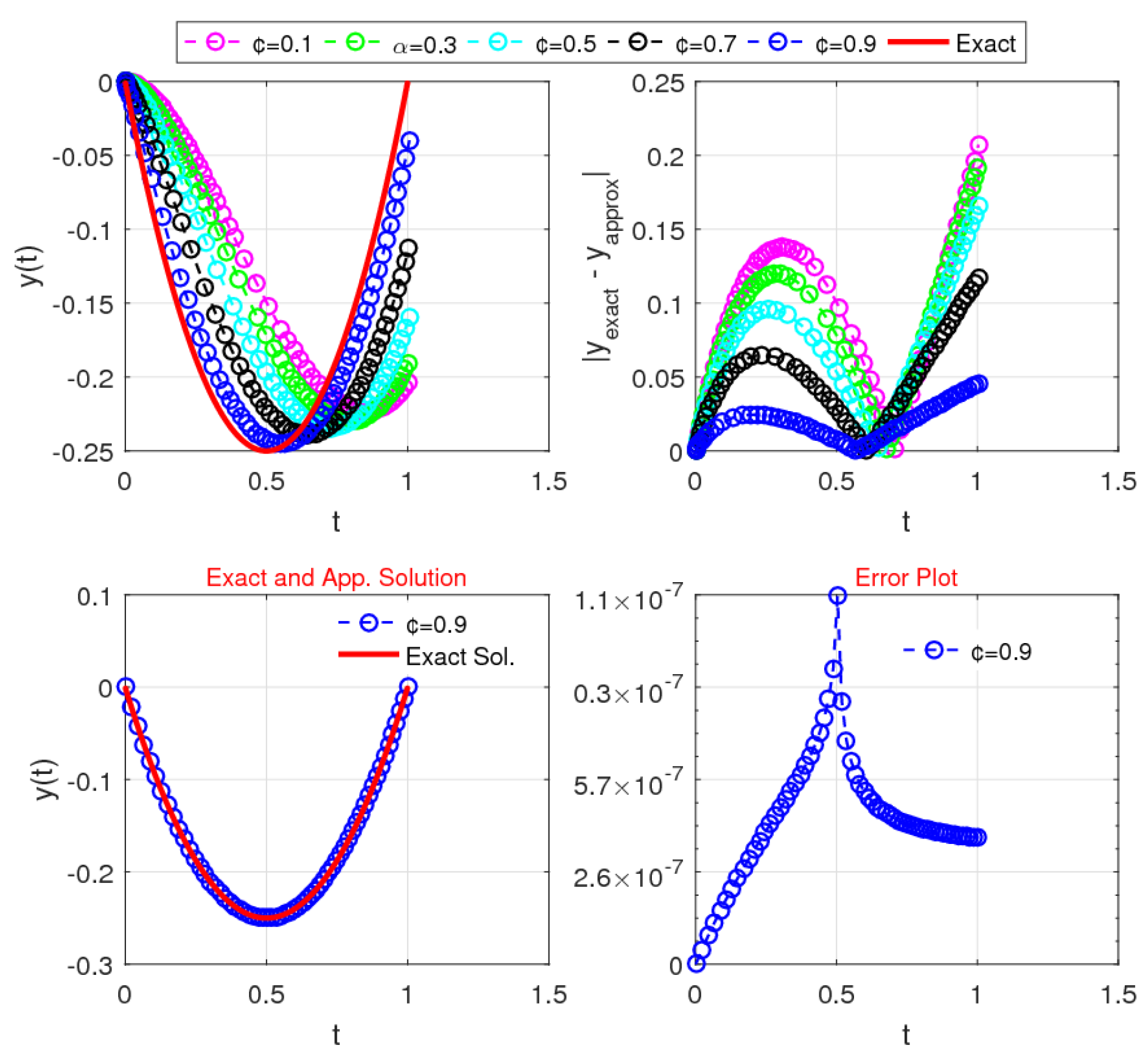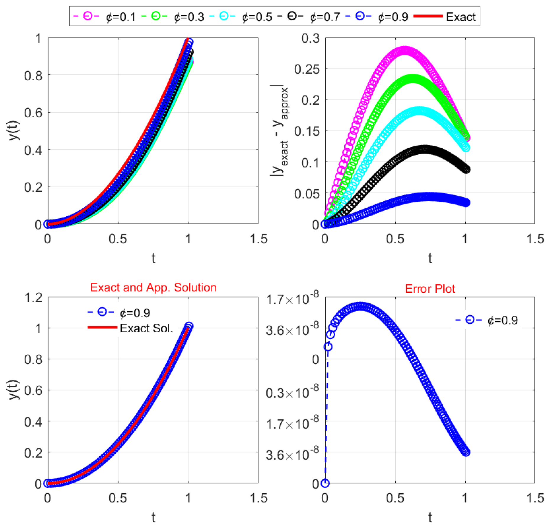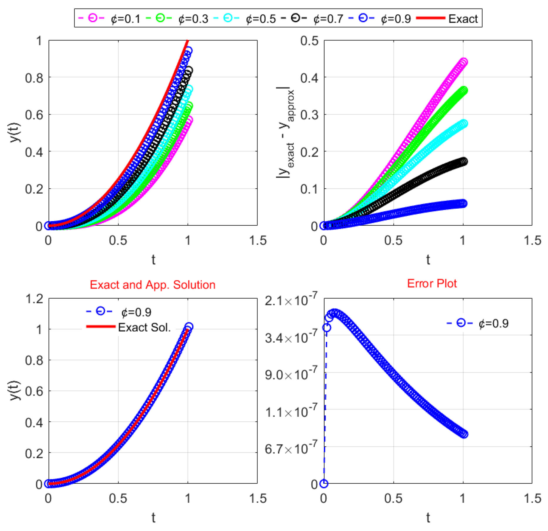 . In the first numerical example, we consider the following FIVP, which is used to effectively model complex systems with memory and hereditary features, as reported in [27]:whereThe exact solution of (60) is Table 2 illustrates the exact and approximate solutions of (