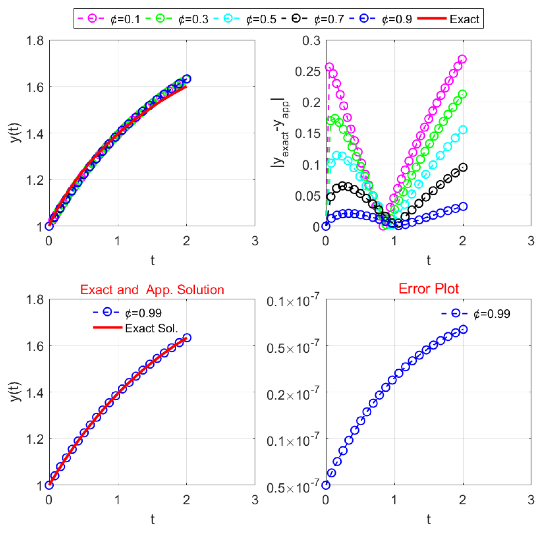 . Consider the fractional initial value problem as follows:where . The exact solution of (62) is Table 8 illustrates the exact and approximate solution of FIVP (