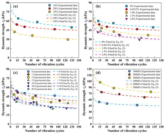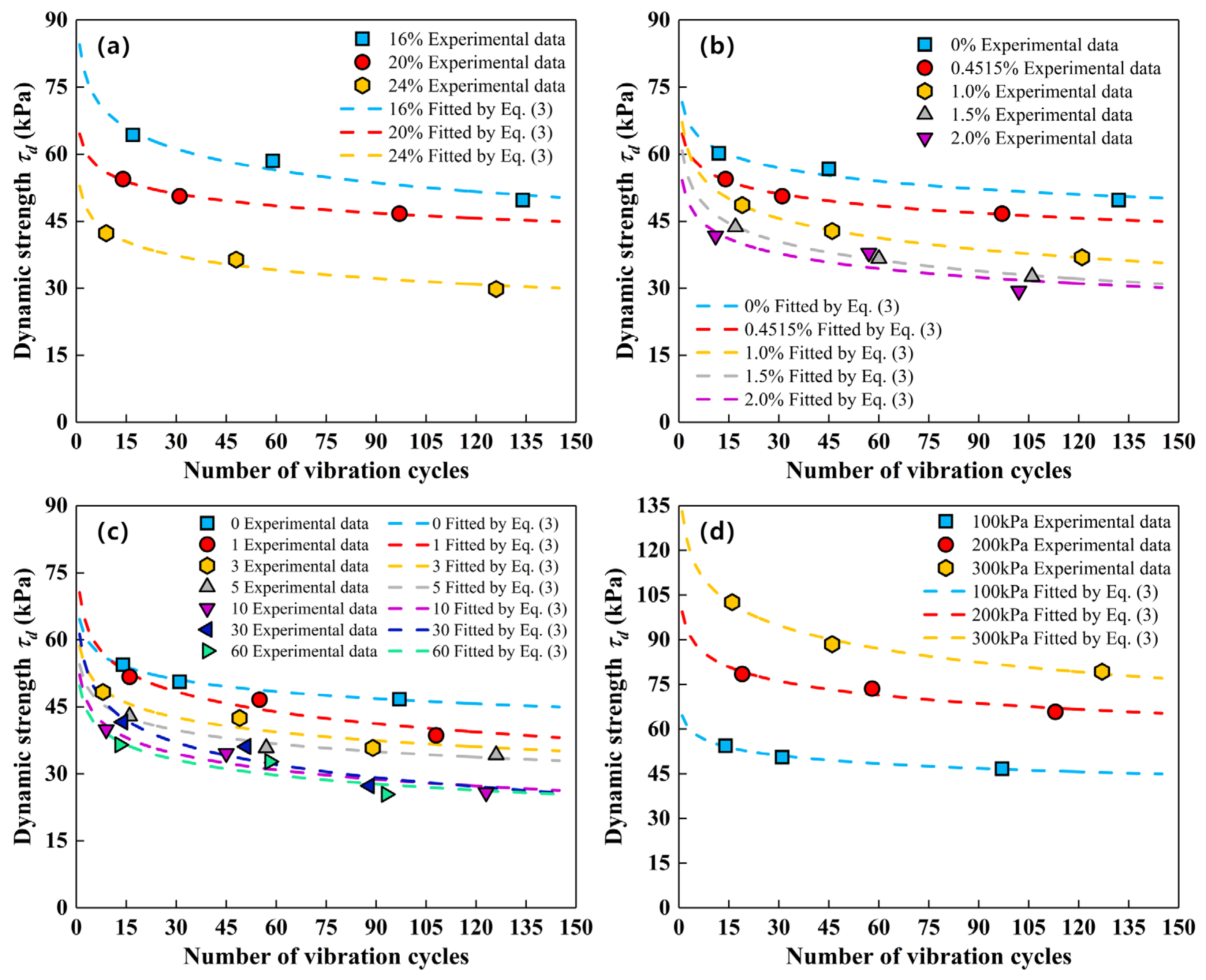 - The relationship between the dynamic strength of saline soil and increasing vibration cycles can be well described by logarithmic functions.