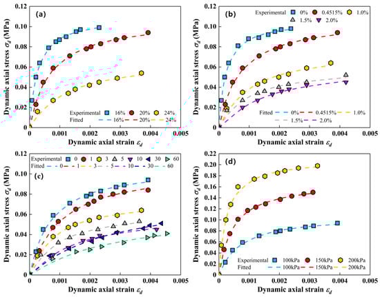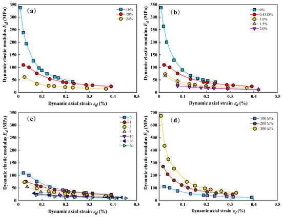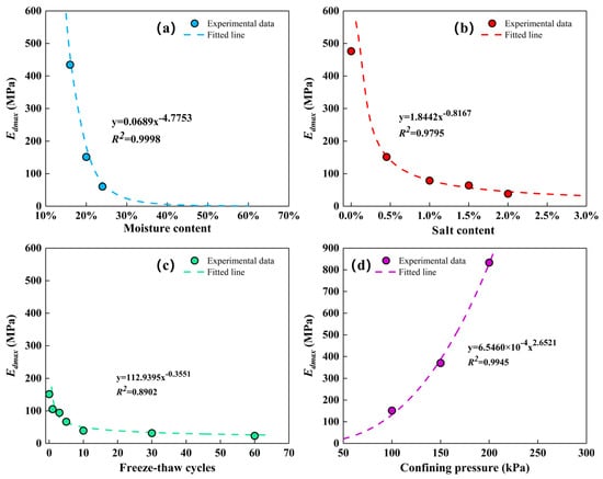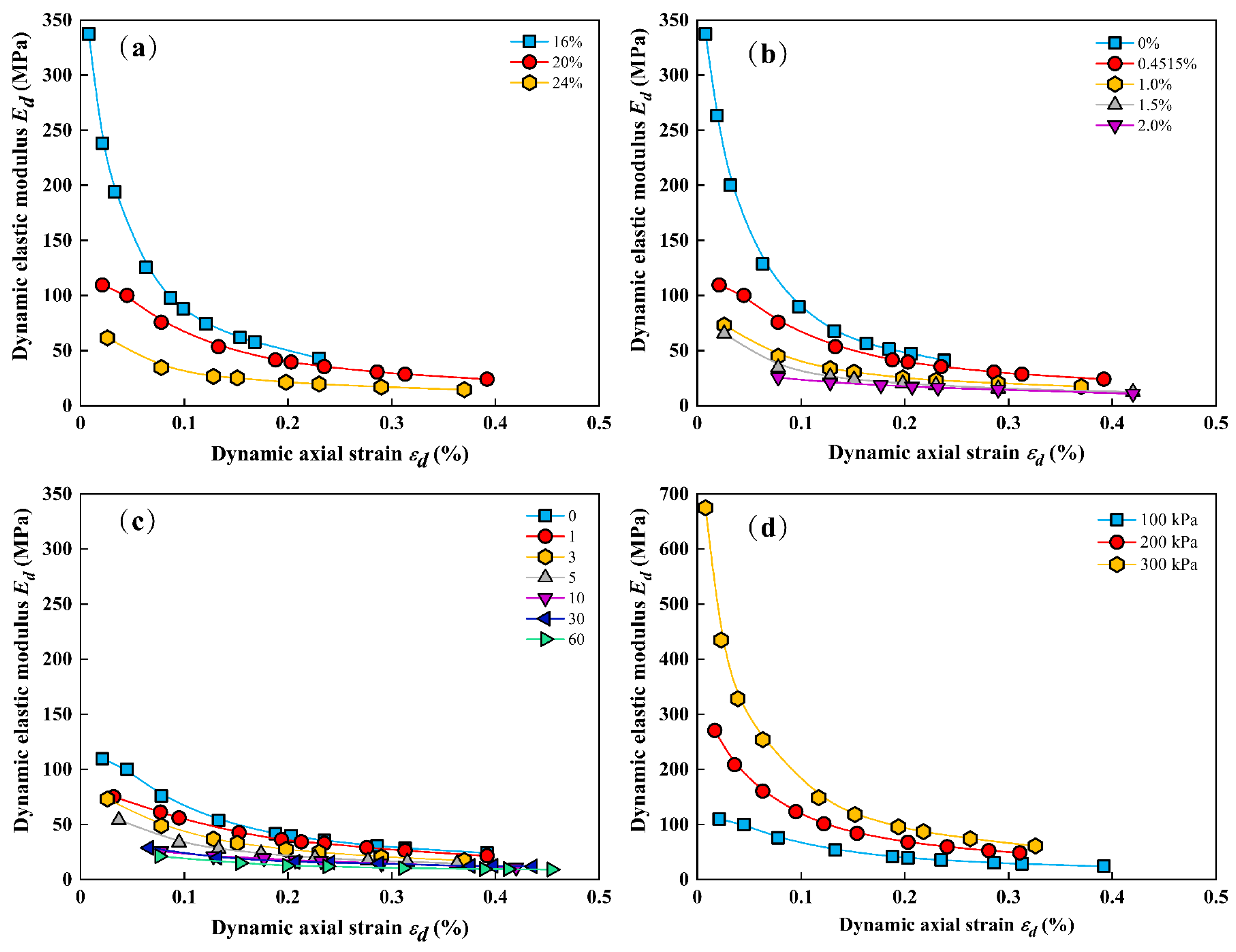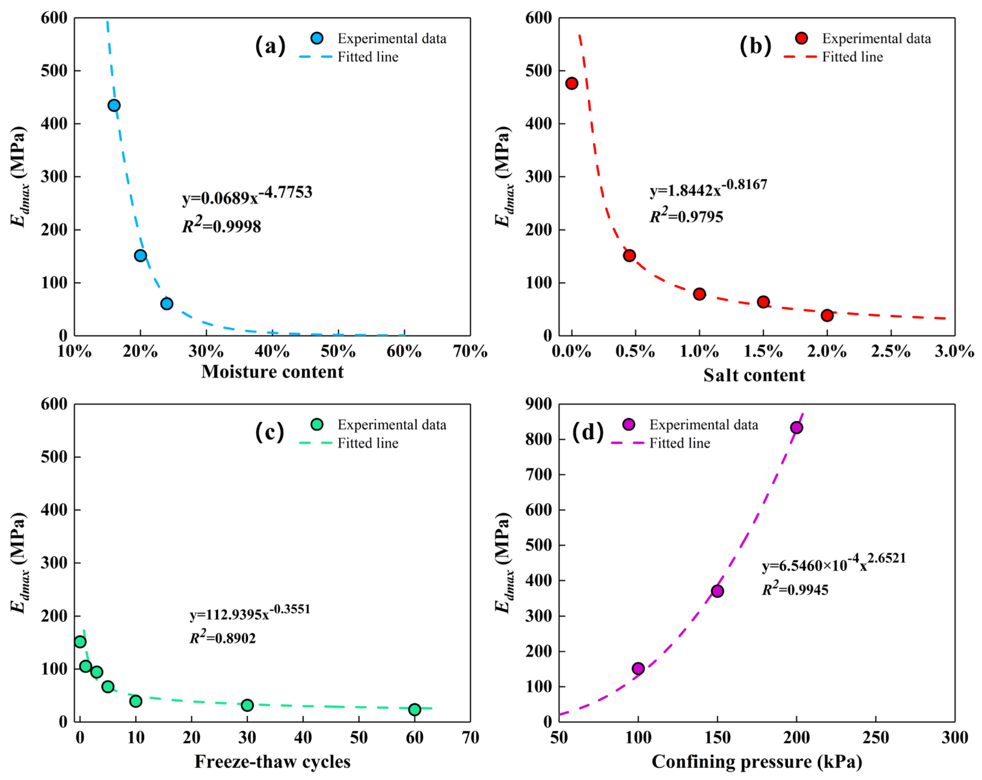 - The dynamic strength and elastic modulus (including the maximum dynamic elastic modulus) both decrease with increasing moisture content, salt content, and freeze–thaw cycle, and increase considerably with increasing confining pressure. In particular, the dispersion of clay particles induced by NaHCO3, the dominant salt in this carbonate saline soil, is identified as the primary mechanism responsible for the observed decrease in dynamic parameters with increasing salt content. Moreover, these dynamic parameters remain almost constant after undergoing five freeze–thaw cycles. The variations in maximum elastic moduli with the above variables can be well expressed by power functions.