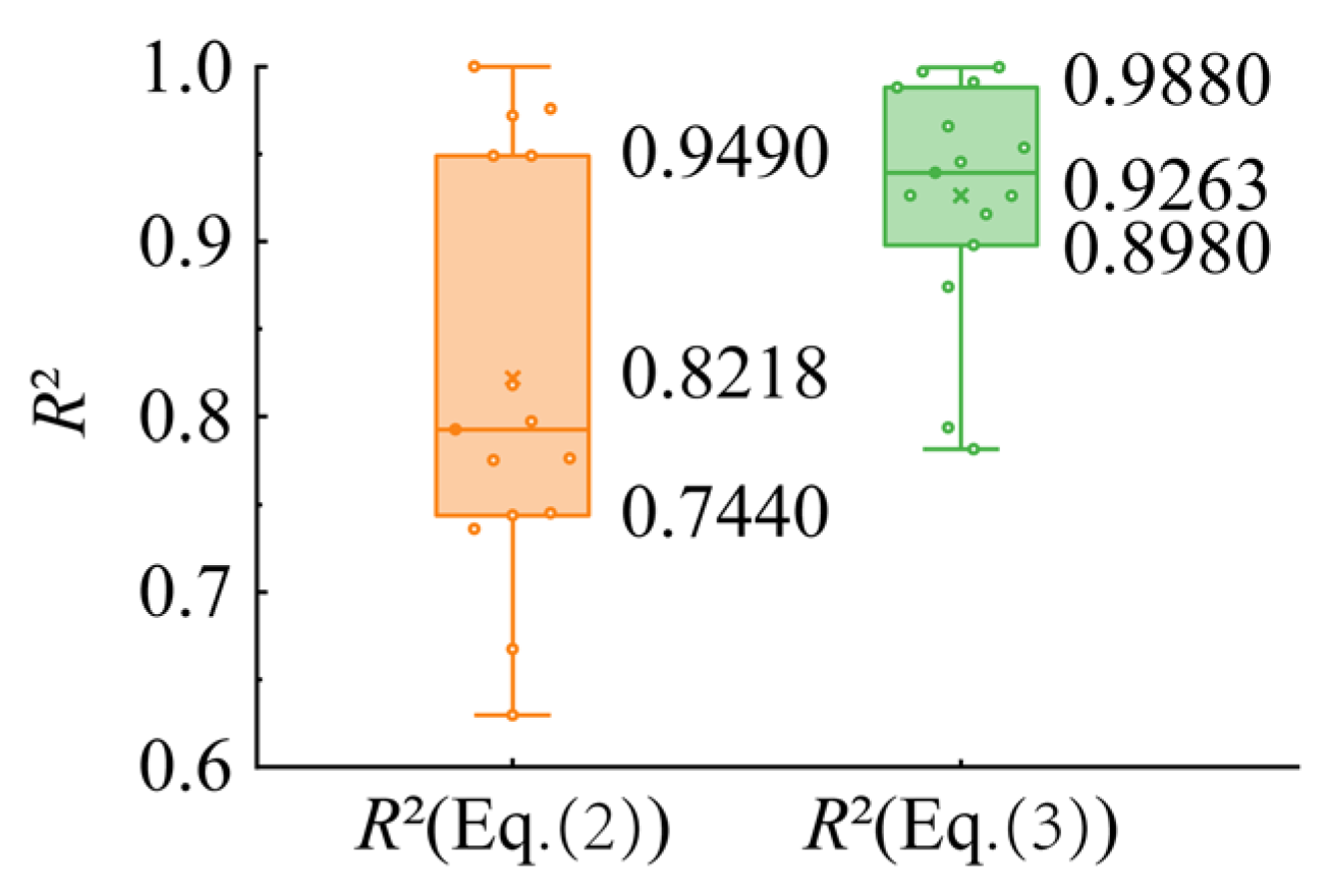 Moisture Content | Salt Content | Freeze–Thaw Cycle | Confining Pressure | Linear Fitting by Equation (2) | Logarithmic Fitting by Equation (3) | ||||