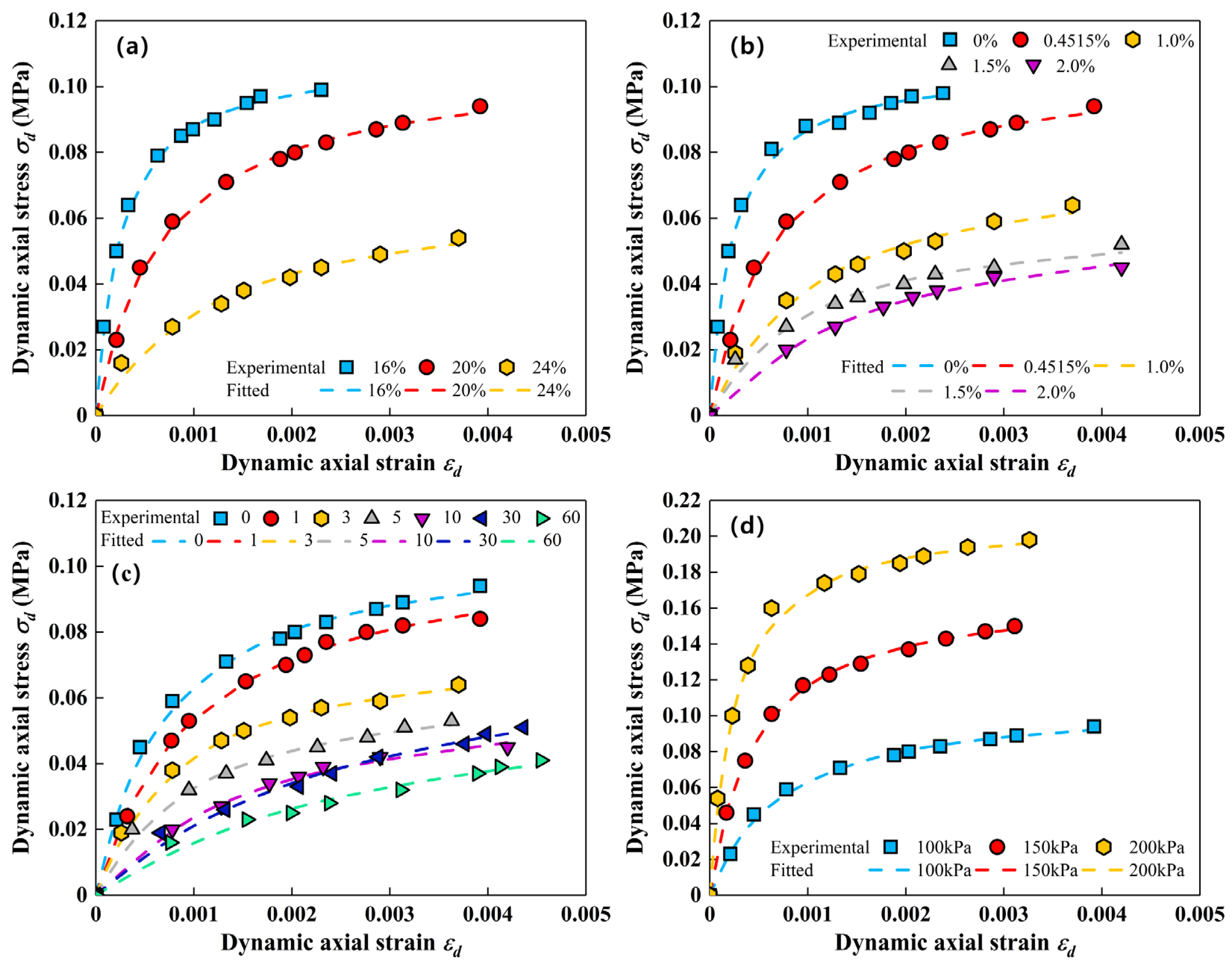 - With increasing dynamic axial strains, the reductions in real-time dynamic elastic moduli are especially significant when the dynamic axial strains are small (<0.2%), then the dynamic strength and elastic modulus basically begin to stabilize at higher dynamic axial strains (>0.2%).