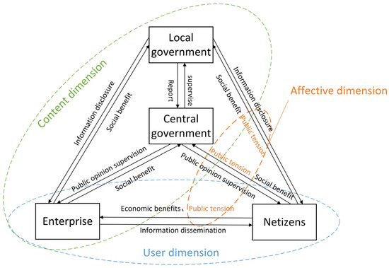 Therefore, this paper combines the concept of public panic in public opinion during enterprise crises under conditions of information asymmetry with tipping point theory; it analyzes the behavioral factors of the central government, local governments, enterprises and netizens in the evolution of public opinion from the three perspectives: content, users and emotions. The specific dimension division is shown in Figure 1.