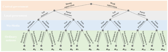 Public panic refers to the anxiety induced by the spread of public opinion. This paper assumes that the maximum level of public panic following an enterprise crisis event is K. The degree of public panic during the decision-making process of the subject is Kni (0 < ni < 1), where ni represents the public panic coefficient. The variables are detailed in Table 1. The dynamic process of the quadripartite game is illustrated in Figure 2 below. The figure depicts the dynamic game process of the quadripartite agents and lists 16 strategy combinations. Assume that the public panic coefficients corresponding to strategy combinations (1), (2), …, (16) are n1, n2, …, n16, respectively.