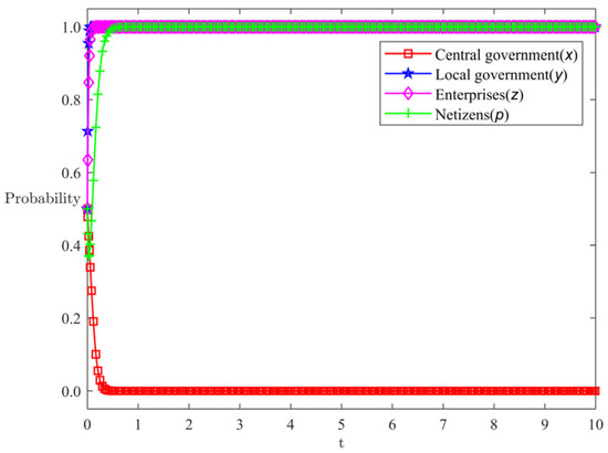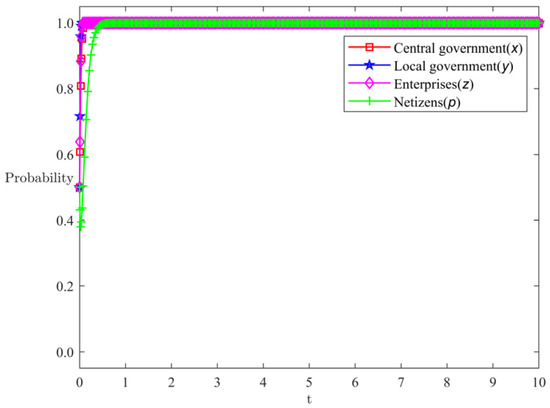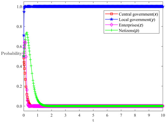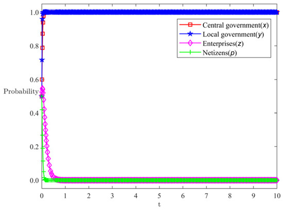At this time, the difference between the public panic degree of the central government’s strong supervision strategy and weak supervision strategy () is greater than the critical value P, so the central government chooses the weak supervision strategy. When , the difference in public panic between the complete disclosure and partial disclosure strategies of local governments () is greater than the critical value Q1, local governments choose the partial disclosure strategy. When , the difference between the public panic degree of the local government’s full disclosure and partial disclosure strategy is less than the critical value Q1. Because the proportion of the public panic degree converted into the loss of the local government’s social income is small, the local government chooses the partial disclosure strategy. For enterprises, the difference in public panic between authentic marketing and deceptive marketing by enterprises () is greater than the critical value V2 (). Enterprises choose the authentic marketing strategy in pursuit of high attention. For netizens, the difference between the cost incurred by netizens when choosing to participate in the dissemination strategy and the social benefits obtained by enterprises when truthfully disseminating () is smaller than the opportunity cost paid by netizens when choosing not to participate in the dissemination but the information is true. This indicates that the opportunity cost paid by netizens when not participating in the dissemination is relatively large, and there is a possibility of obtaining benefits by participating in the dissemination. At this point, netizens choose to participate in the dissemination.