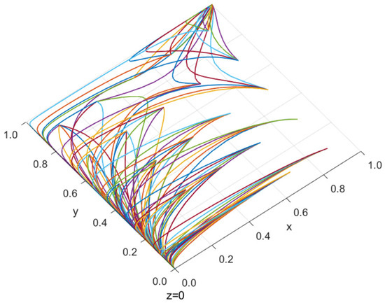 According to Table 2, the replication dynamic equation f for the expected returns and strategy choices of each party was derived (see Appendix A), and the expected returns of each entity were calculated (Formulas (A16)–(A19)). The equilibrium point is obtained by setting the equation f to zero. The Jacobian matrix J was constructed by using the first method of Lyapunov (see Appendix A). Analyze the eigenvalues corresponding to each equilibrium point strategy combination to determine the asymptotic stability of the equilibrium points. The eigenvalues of the equilibrium points of each strategy are shown in Table A1. It is determined that the 12 equilibrium points may have stability, and the stability conditions are shown in Table 3.