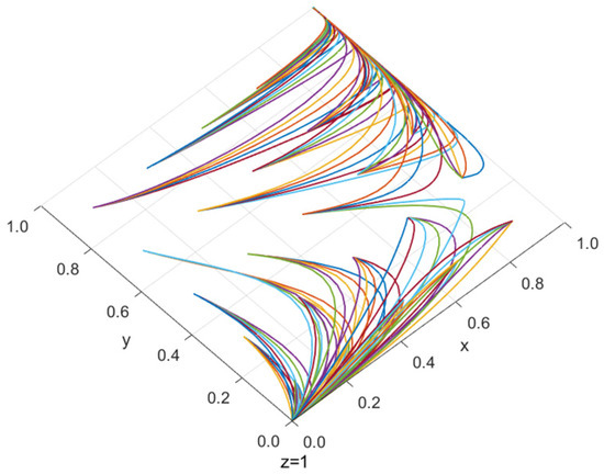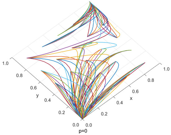 Figure 3 shows the evolutionary stabilization strategy (1, 1, 1, 1) simulated according to the initial assignment. Figure 4 shows the evolutionarily stable strategy (1, 1, 0, 0) after changing the values of E3, n4 and n12 to 80, 0.7 and 0.65, respectively, on the basis of the initial assignment. Figure 5 shows the evolutionarily stable strategy (0, 1, 1, 1) with the values of S2, C3, n1, n9 and n11 changed to 120, 20, 0.5, 0.2 and 0.1. Figure 6 shows the evolutionarily stable strategy (0, 1, 0, 0) obtained by changing S2, E2, E4, E5, n4 and n12 to 130, 220, 30, 20, 0.9 and 0.6.