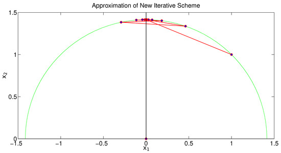 In addition to the step sizes, it is necessary to establish clear termination criteria for the iterative scheme. To this end, two stopping conditions are introduced. The first is a tolerance threshold for the error, which we set at . This ensures that the procedure terminates once two successive iterates in the orbit become sufficiently close, thus providing a guarantee of numerical accuracy. The second condition is a maximal number of iterations, fixed at . This serves as a safeguard against divergence or excessively long computations, preventing the algorithm from running indefinitely.
