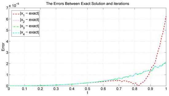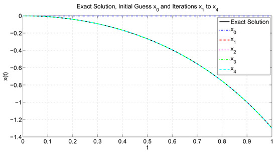 It can be easily shown that this operator satisfies the Garcia–Falset property and has a fixed point in . By Theorem 10, the iterative algorithm (1) generated by T converges to . For the initial guess and choices of parameters and . Figure 10 and Figure 11 compare the exact solution to the approximate solutions obtained using a new method. At first glance, the new solutions seem almost identical to the exact one. However, upon closer inspection, tiny differences become apparent. These small deviations indicate that while the new method is highly precise, there is a minimal numerical error involved. Despite this, the close agreement between the exact and new solutions demonstrates the effectiveness and reliability of the proposed approach, making it an appropriate method for solving such problems.