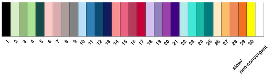 The output of the numerical algorithm is a colored picture (named polynomiograph), emphasizing the behavior of orbits. The black points indicate precisely the solutions, while white points mark the inefficient initial estimates. All the other colors in the color palette present information about a particular length of the orbit. There is an obvious difference in color intensity when comparing a procedure based on the new iteration with the corresponding standard procedure. More precisely, less intense colors indicate shorter orbits, hence a more efficient algorithm. For clarity, the legend of the colors used is shown in Figure 12.