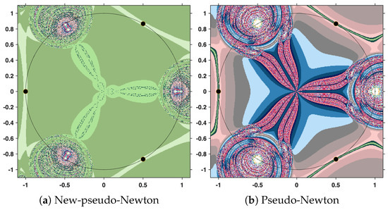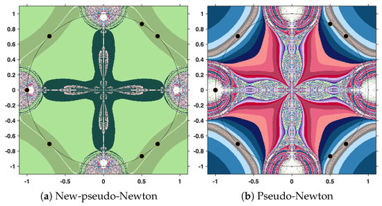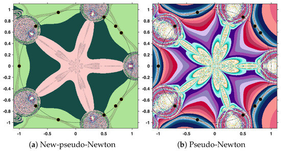 Polynomiographs for New-pseudo-Newton and standard pseudo-Newton iterations.