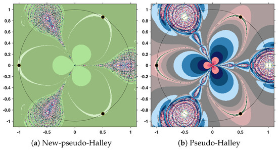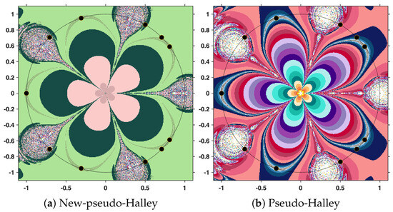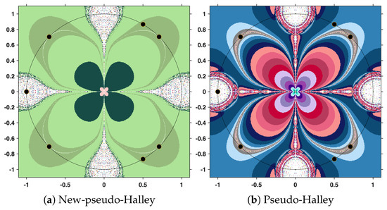 Polynomiographs for New-pseudo-Halley and standard pseudo-Halley iterations.