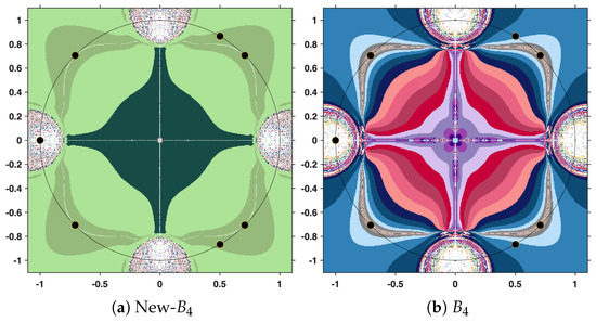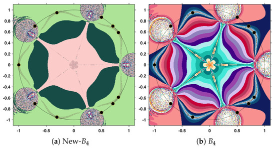 Therefore, the iterative construction will be terminated as soon as at least one of these conditions is satisfied: either the distance between two consecutive elements of the orbit falls below the prescribed tolerance, or the orbit has been extended to the limit of 31 iterations. In this way, the process balances both accuracy and computational efficiency, while allowing a fair comparison between the New-MMP and the classical MMP procedures. The resulting polynomiographs are pictured in Figure 13, Figure 14 and Figure 15.