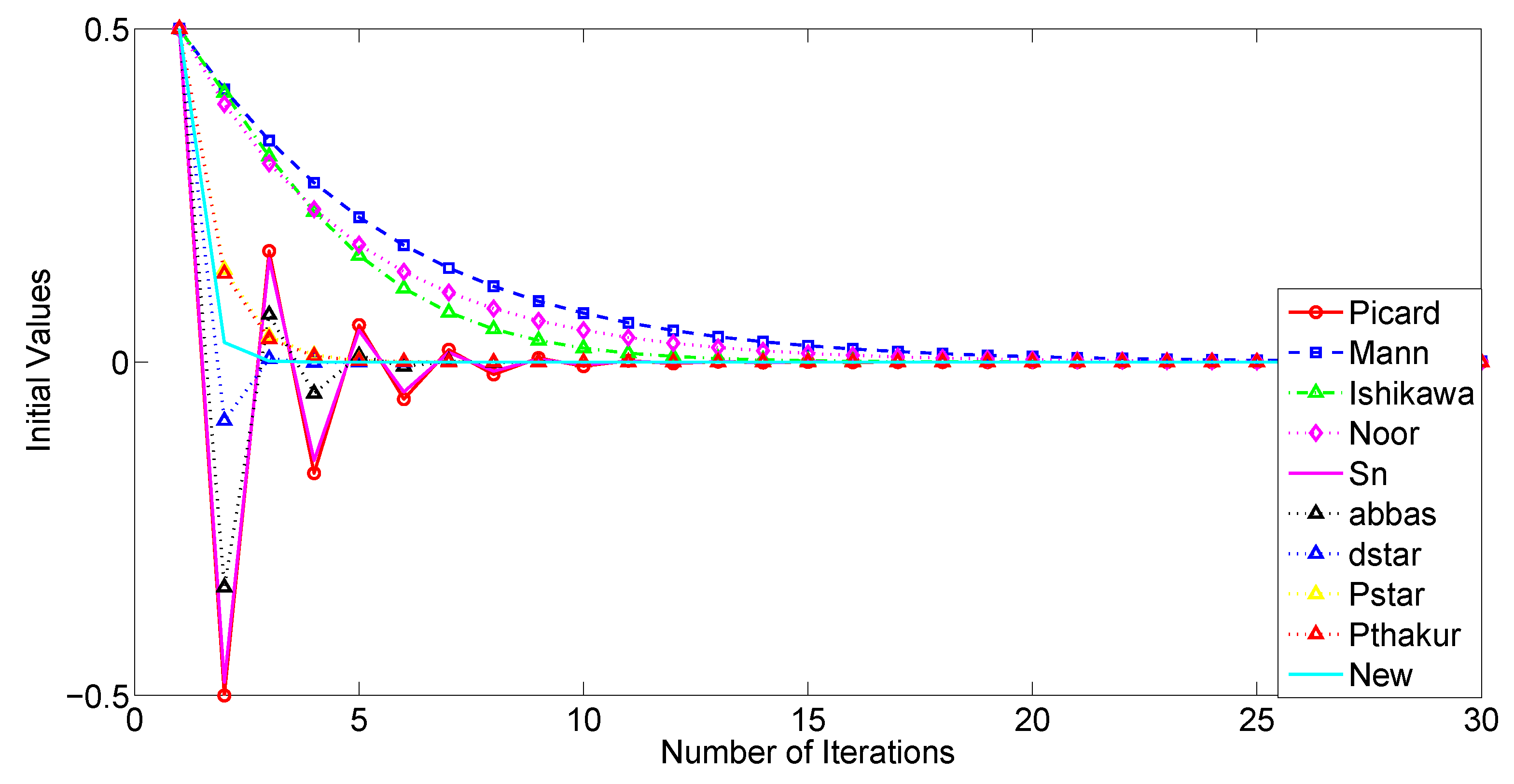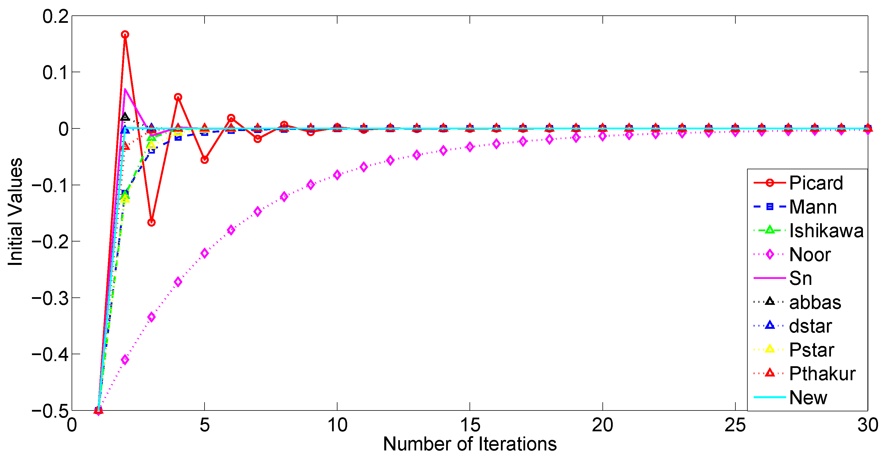 1) in the framework of Example 1 to compare their effectiveness and investigate the impact of different initial values on the convergence of these iteration schemes by varying the parameter