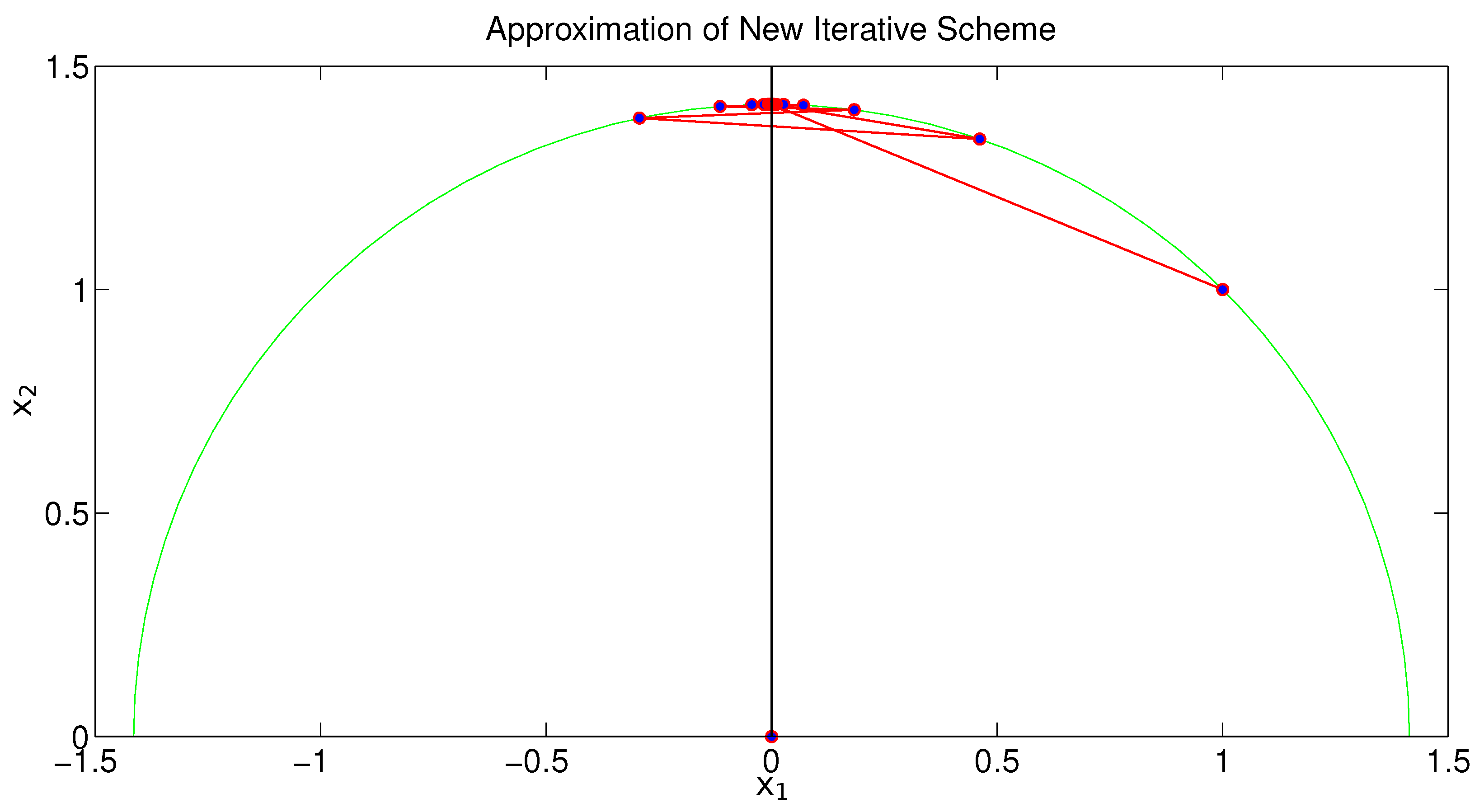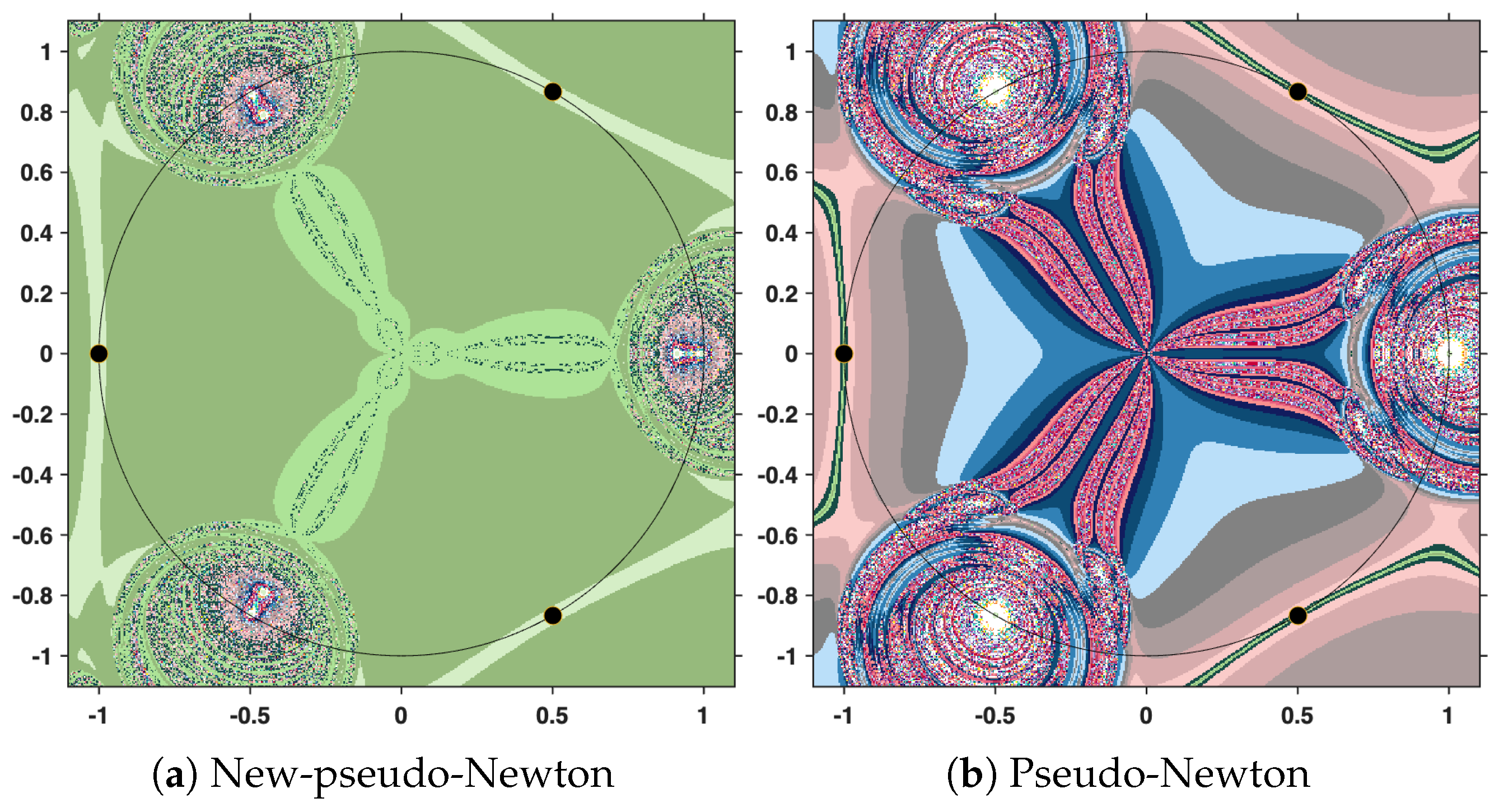 The goal here is to apply the iterative procedure (1) starting from a chosen initial estimate to obtain the corresponding fixed point of T. To perform this, it is first necessary to have a clear understanding of how can be computed exactly. Given two points and a scalar , we aim to derive an explicit expression for , i.e., the unique point on the geodesic segment between x and y, such that According to [29], it has been proven that for two given points, and , one haswhereand We now incorporate the formula derived above into the iterative scheme (1) to approximate the fixed point of the hyperbolic nonexpansive operator T. To illustrate this, we take the initial guess and set the permissible error to . The stopping condition for the algorithm is defined as where d denotes the Poincaré metric. Figure 9 illustrates the approximate sequence from the initial guess to the computed solution. It is worth noting that the entire sequence lies on the geodesic connecting and (depicted as the green semicircle). 6. Comparison via Polynomiography