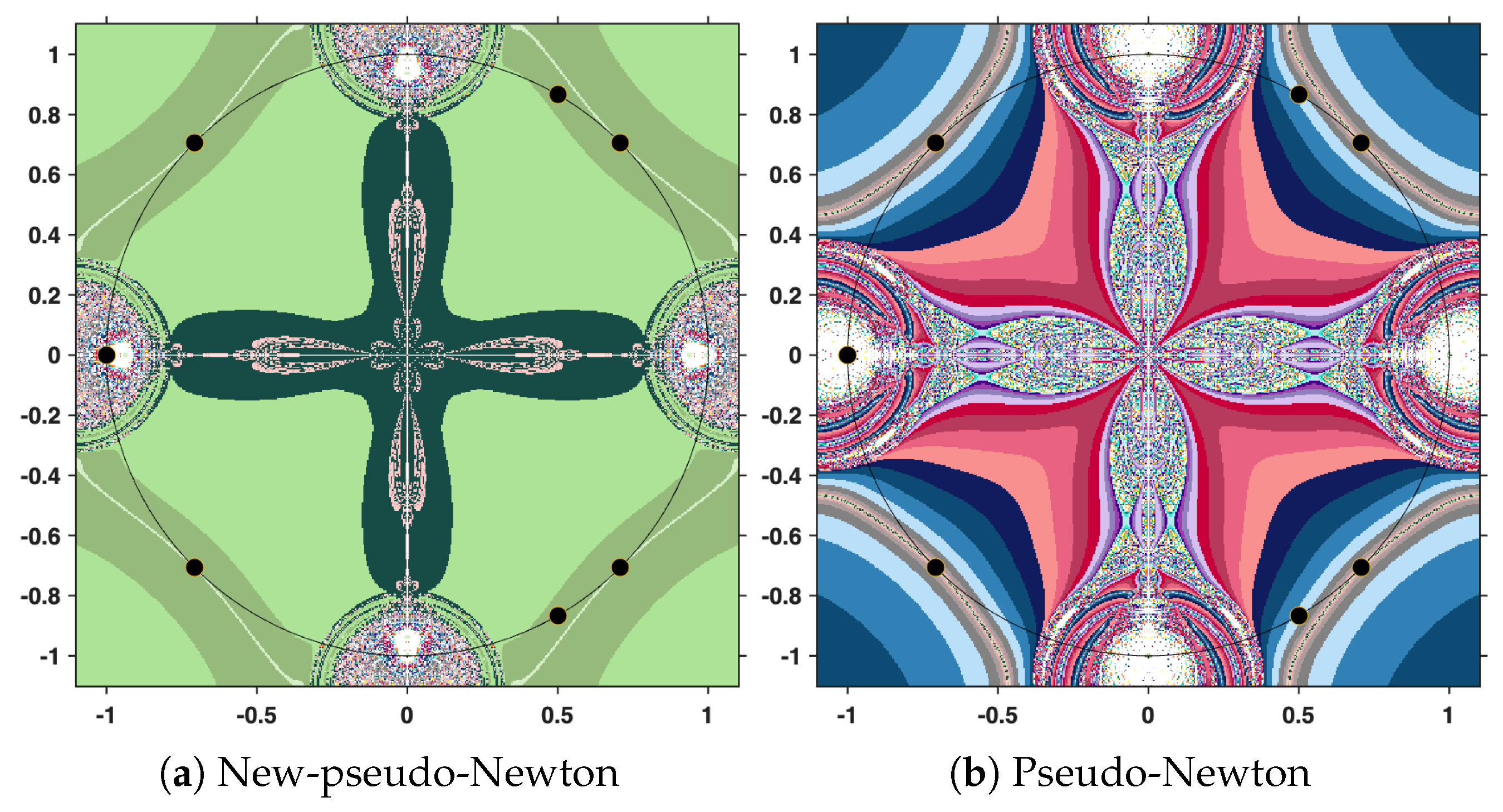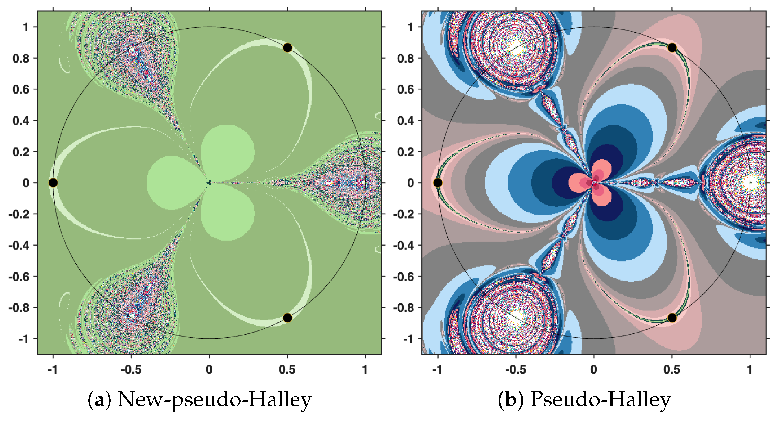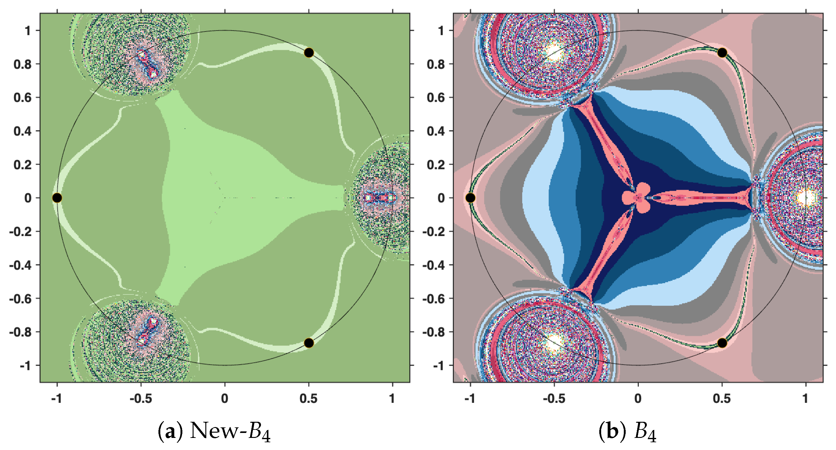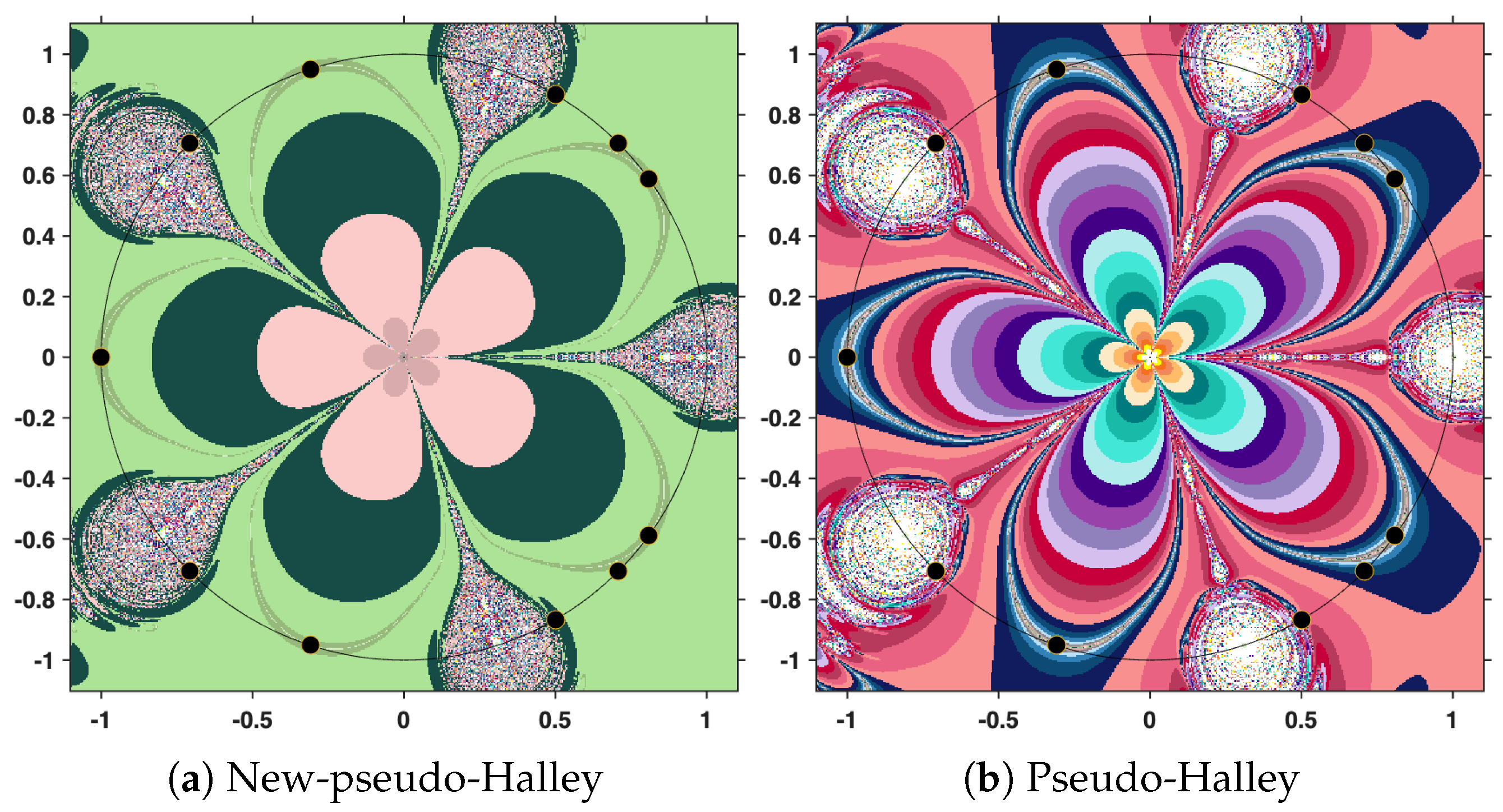Therefore, the iterative construction will be terminated as soon as at least one of these conditions is satisfied: either the distance between two consecutive elements of the orbit falls below the prescribed tolerance, or the orbit has been extended to the limit of 31 iterations. In this way, the process balances both accuracy and computational efficiency, while allowing a fair comparison between the New-MMP and the classical MMP procedures. The resulting polynomiographs are pictured in