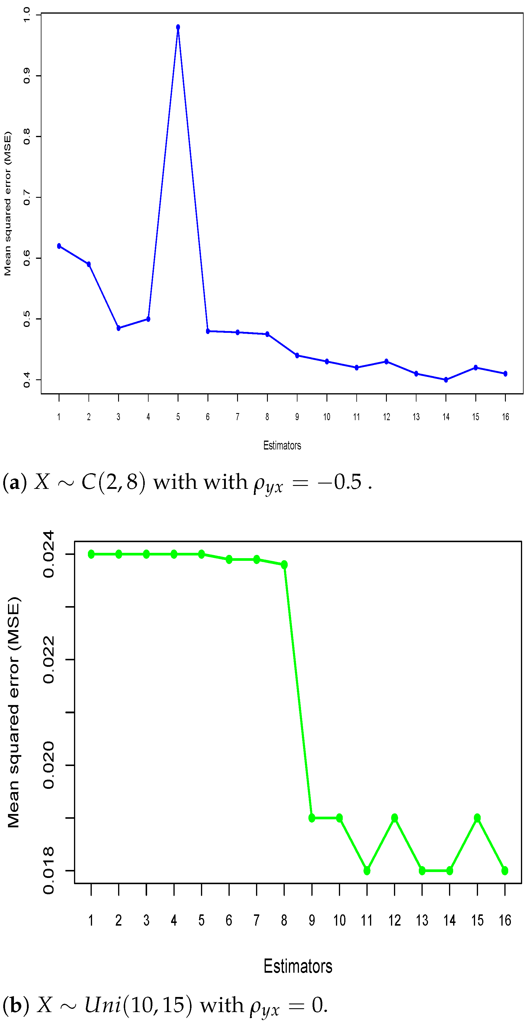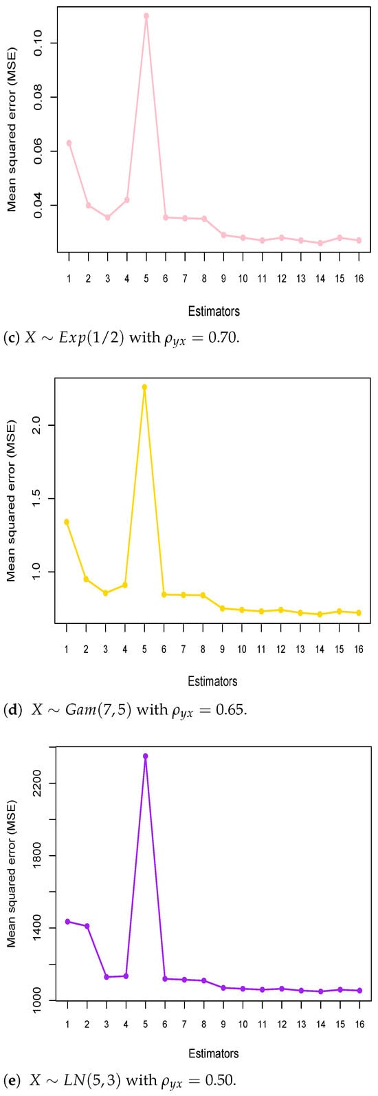 - Across both simulated and real datasets, the proposed transformation-based estimators outperformed ratio-type, exponential-type, and difference-type estimators . Table 4 and Figure 1 highlight these gains in simulated populations, while Table 6 and Figure 2 show similar improvements in real-life applications. In almost every case, the MSE of the proposed estimators was the smallest among all methods tested.
