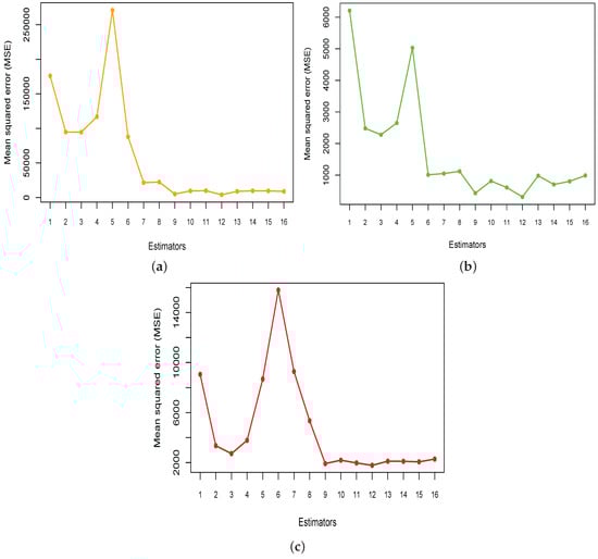 Figure 2. The graphical summary shows MSE values for both suggested and established estimators obtained using real datasets. For ease of reference, the estimators are labeled with numbers between 1 and 16. (a) Source: []. (b) Source: []. (c) Source: []. - In Table 4, the proposed estimators consistently achieved lower MSEs than the traditional methods for all five distributional, settings Cauchy, uniform, exponential, gamma, and log-normal, covering heavy-tailed, skewed, and symmetric cases. Figure 1a–e visually confirs this trend, where the proposed estimators form the lowest bars across each distribution.