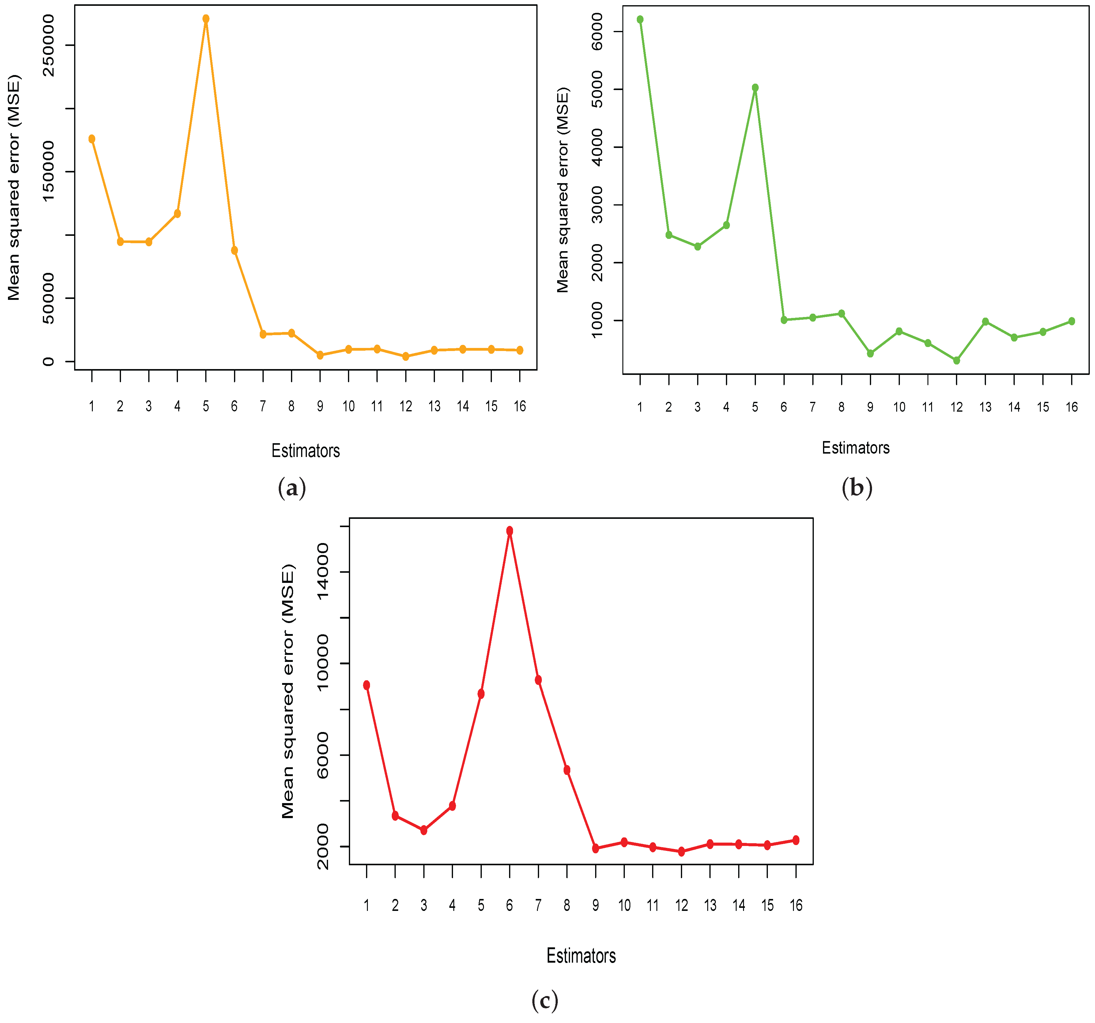 - The outcomes in Table 6 demonstrate that the proposed estimators also perform strongly with real survey data, including socio-economic and environmental datasets. Figure 2a–c show that for all three populations, the proposed estimators, particularly , consistently appear among the best-performing results on the MSE scale, surpassing both exponential- and difference-type estimators.